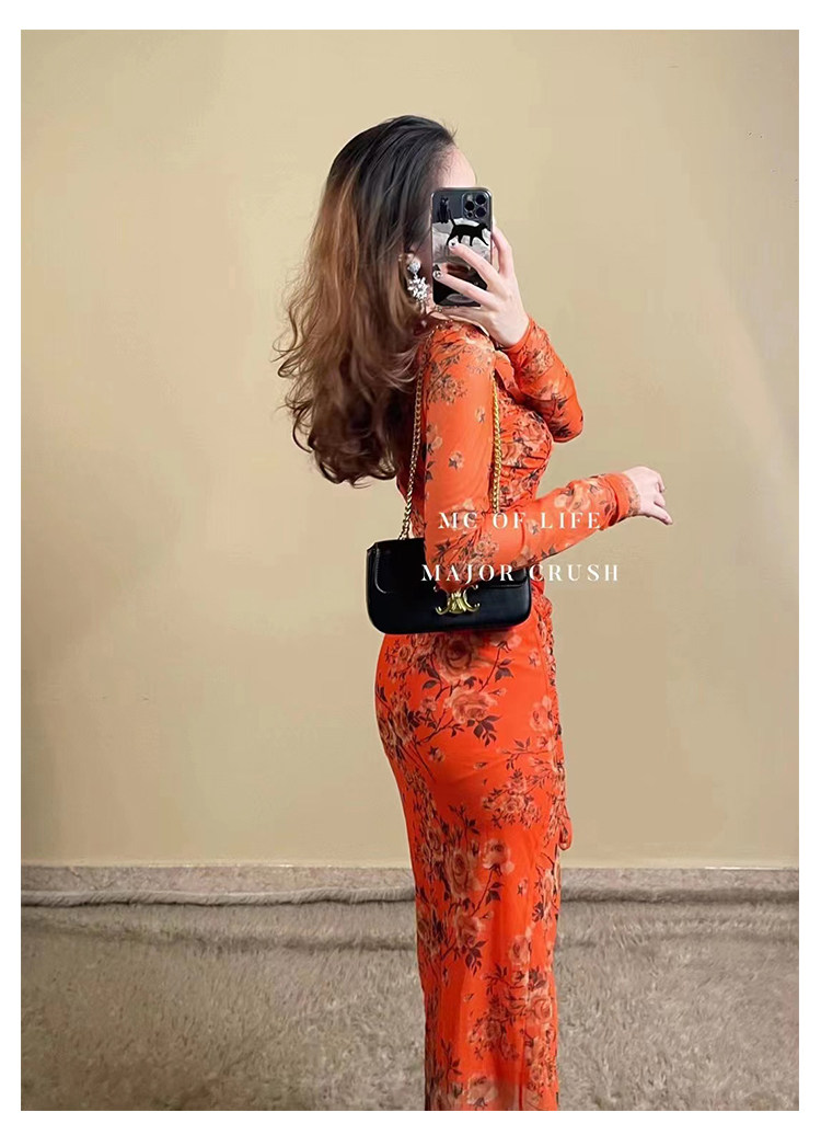 产品名称 | Product name: MC褶皱弹力碎花连衣裙23年春夏新款下摆大开叉显瘦显身材原创设计