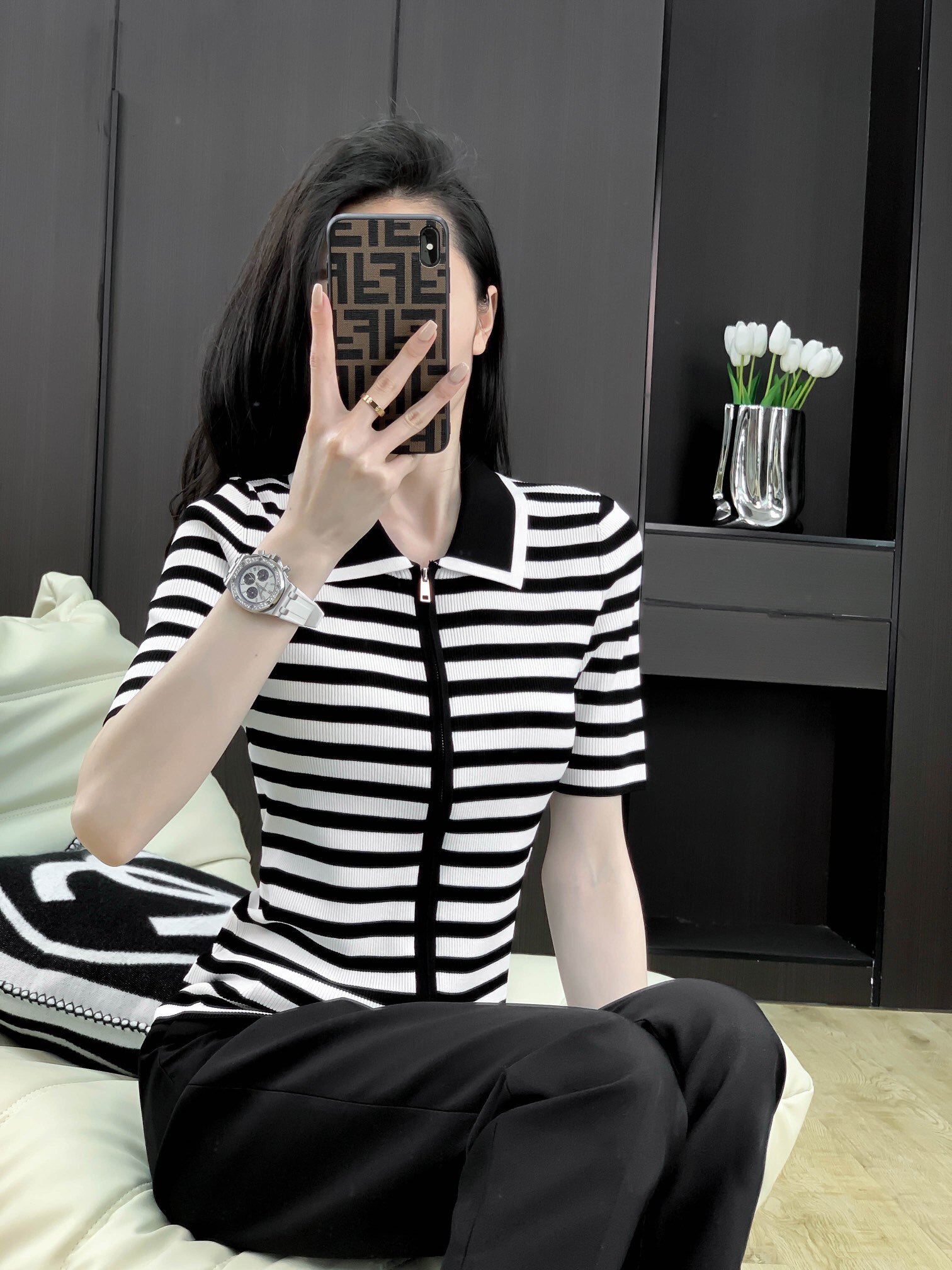 产品名称 | Product name: 2023夏季新款进口天气纱翻领拉链短袖女针织上衣女