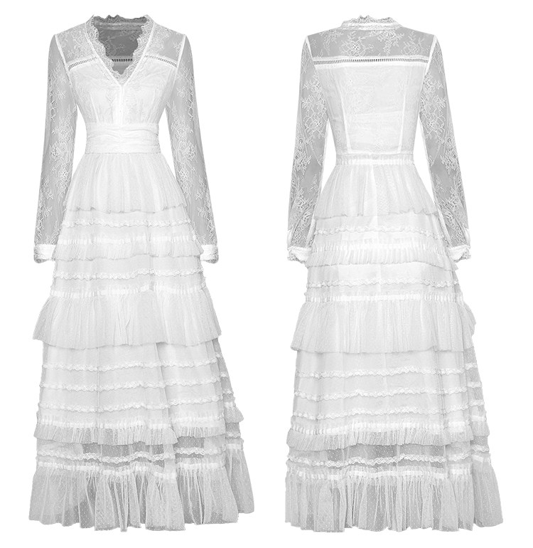 商品名称:V领长袖钉珠蕾丝拼接收腰荷叶边蛋糕裙网纱蓬蓬连衣裙