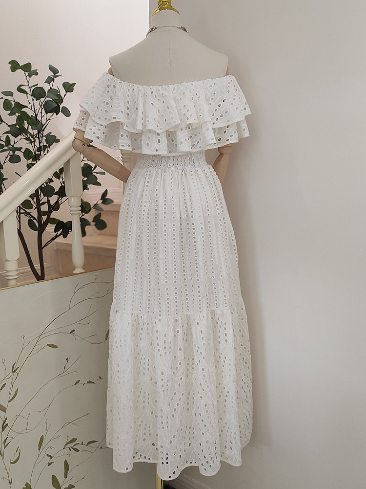 产品名称 | Product name: 法式小众设计感一字肩荷叶边重工刺绣镂空度假风沙滩长裙连衣裙夏