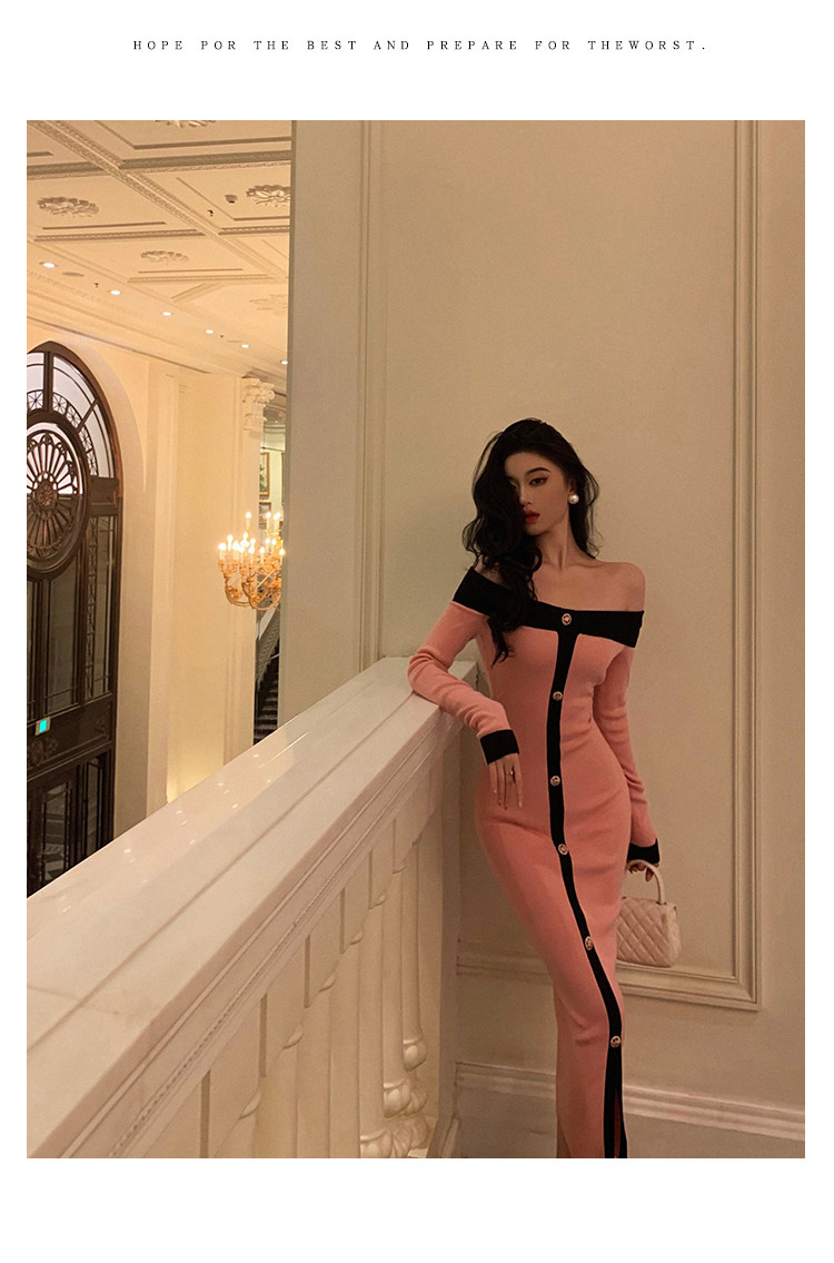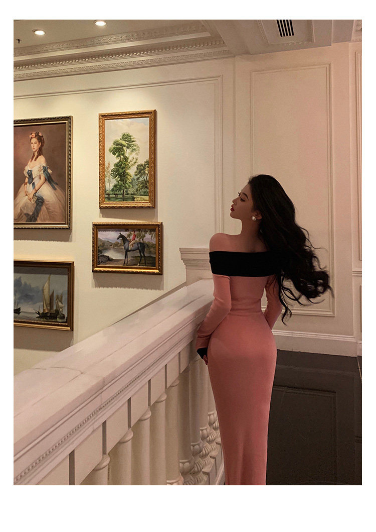 产品名称 | Product name: 一字肩针织连衣裙女2023秋冬新款撞色紧身显瘦包臀中长裙
