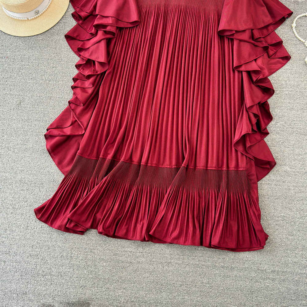 高级感轻奢名媛三宅褶皱飞飞袖宽松显瘦a字连衣裙优雅气质长裙子