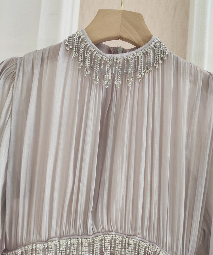 法式小众设计感重工洋气镶钻流苏褶皱亮丝收腰修身木耳边连衣裙春