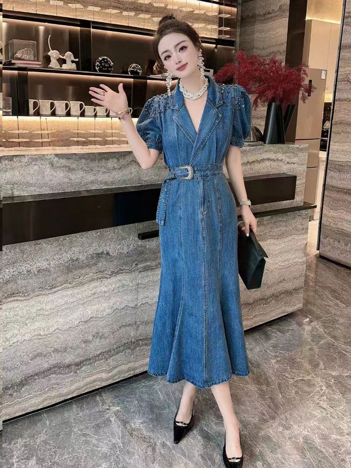 产品名称 | Product name: 装领重工镶钻露背水洗牛仔修身气质鱼尾连衣裙女