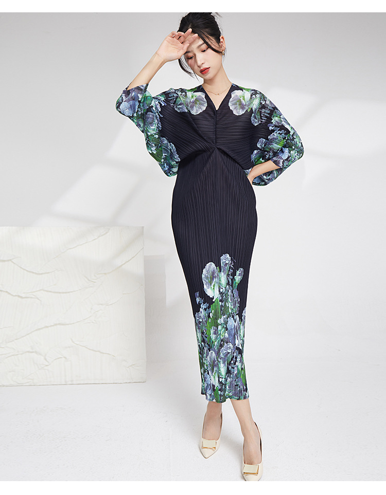 三宅褶皱大码连衣裙女宽松遮肉显瘦印花减龄蝙蝠袖长款直筒裙洋