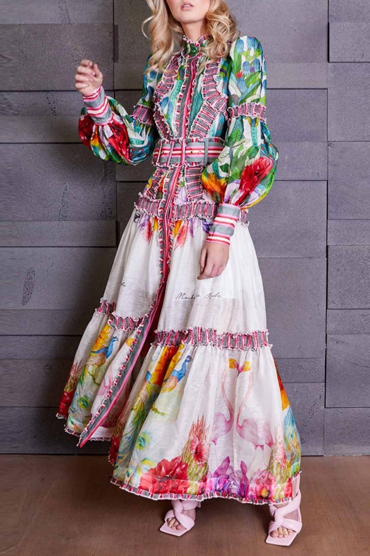 产品名称 | Product name: 澳洲设计师品牌灯笼袖印花荷叶边单排扣大摆度假甜美优雅连衣裙女