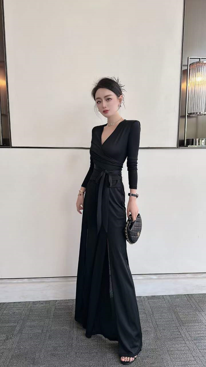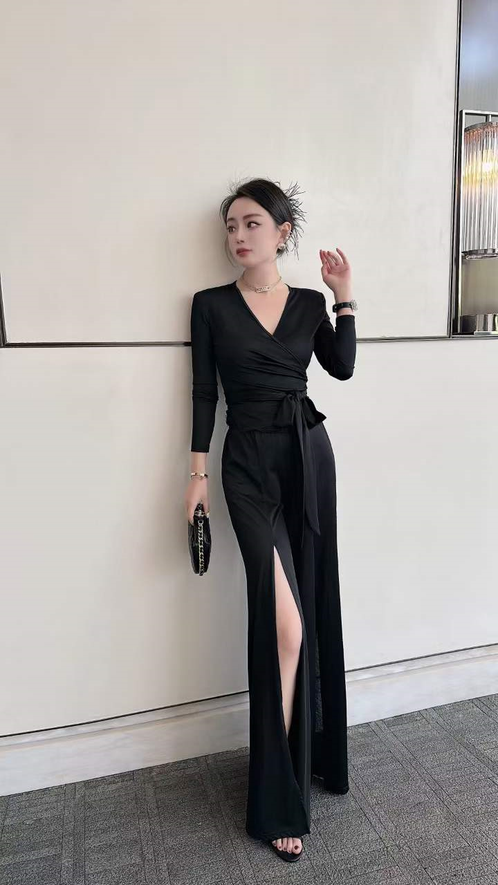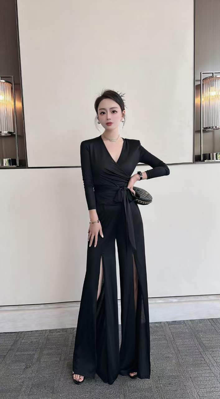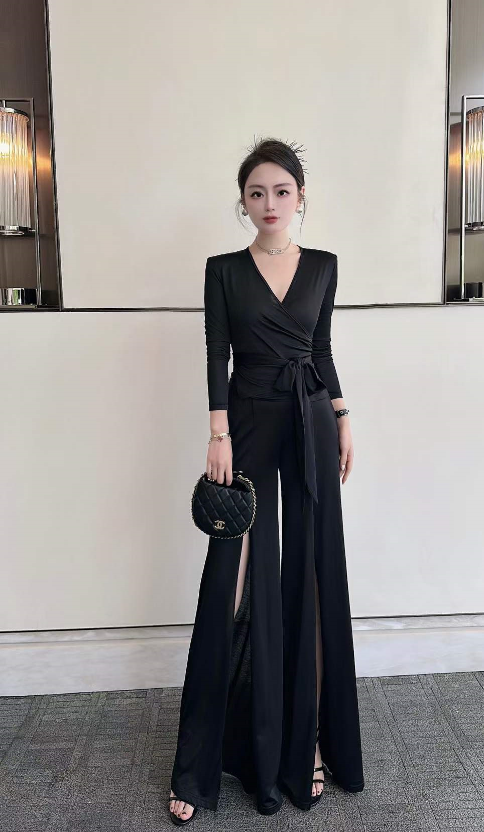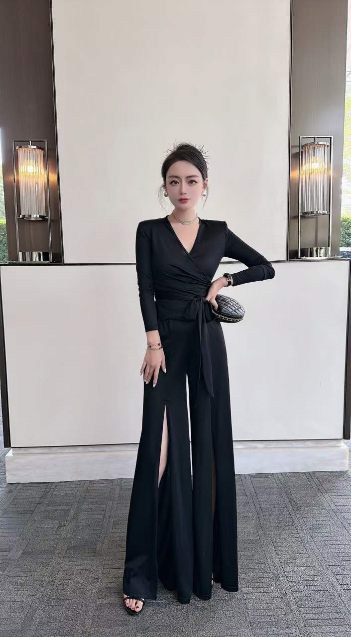 产品名称 | Product name: 时髦洋气套装裤女V领绑带上衣+开叉阔腿喇叭裤