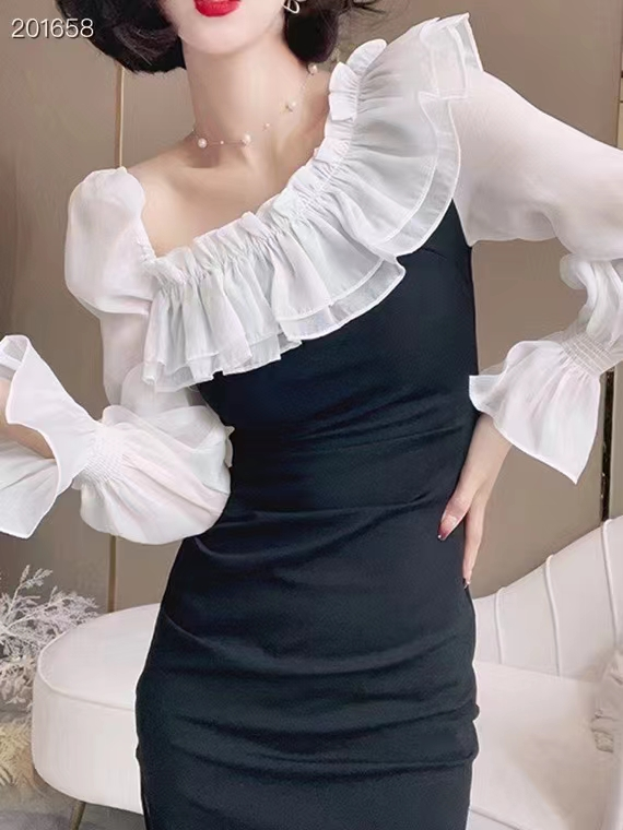 产品名称 | Product name: 2023 气质荷叶领名媛拼色修身连衣裙女