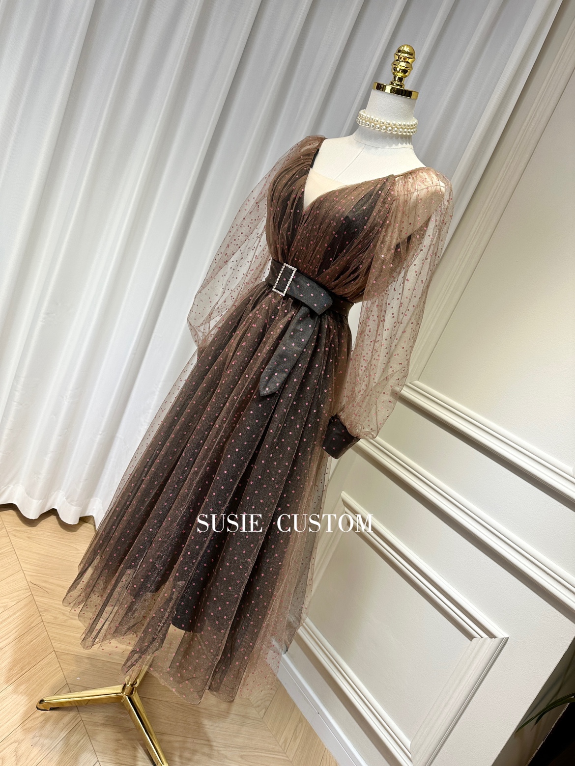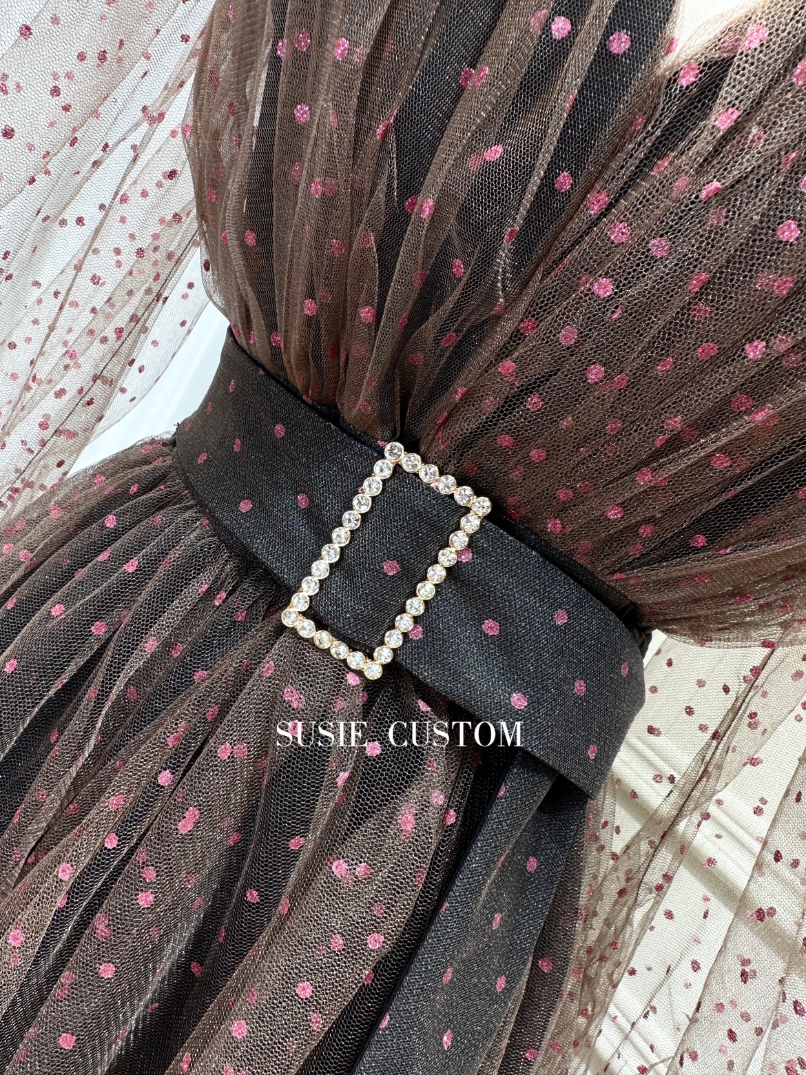 产品名称 | Product name: 高定复古法式闪闪波点透泡泡袖深V收腰配腰带蓬蓬网纱长裙礼服裙
