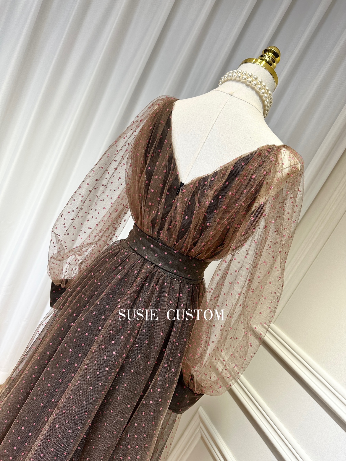 高定复古法式闪闪波点透泡泡袖深V收腰配腰带蓬蓬网纱长裙礼服裙
