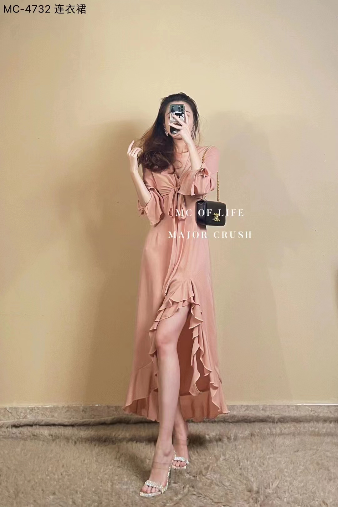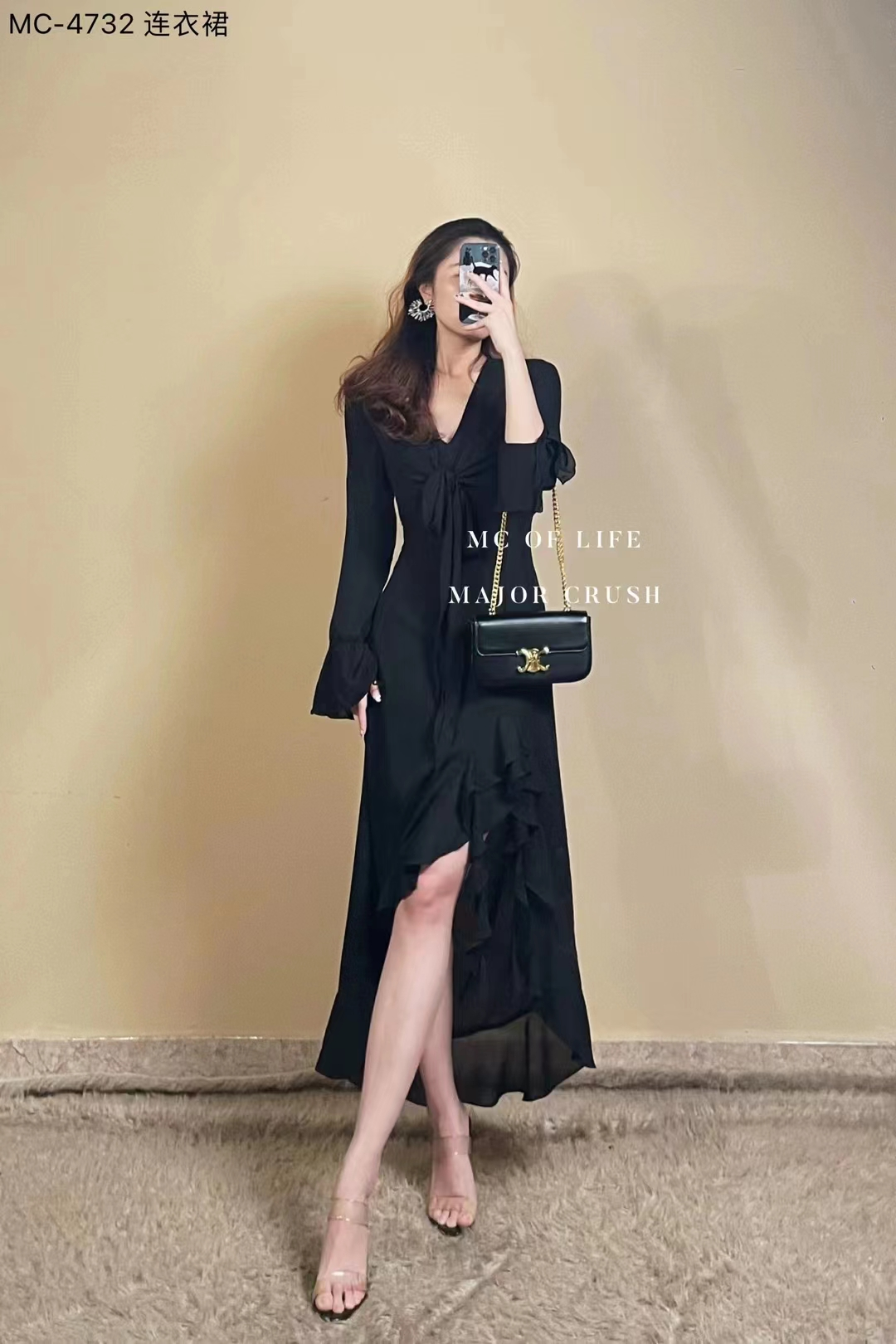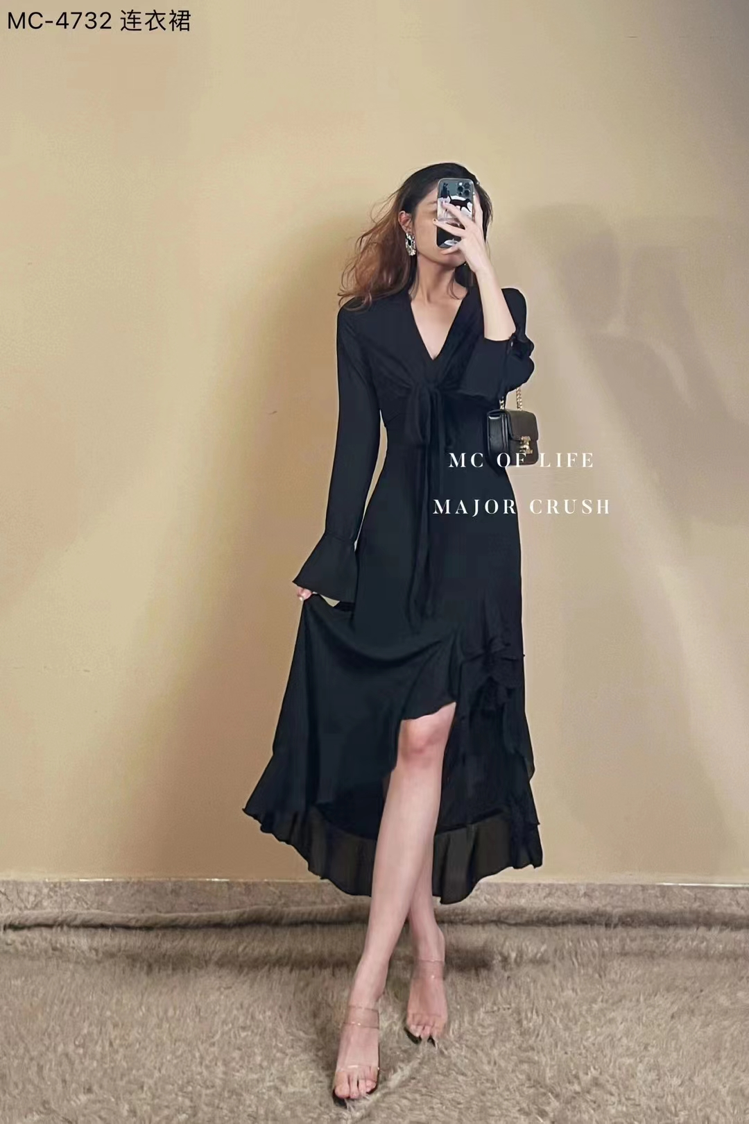 产品名称 | Product name: 超仙垂感木耳边茶歇连衣裙不规则裙摆23年新款小众设计