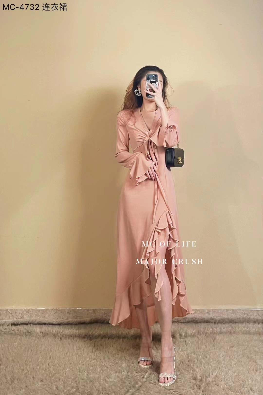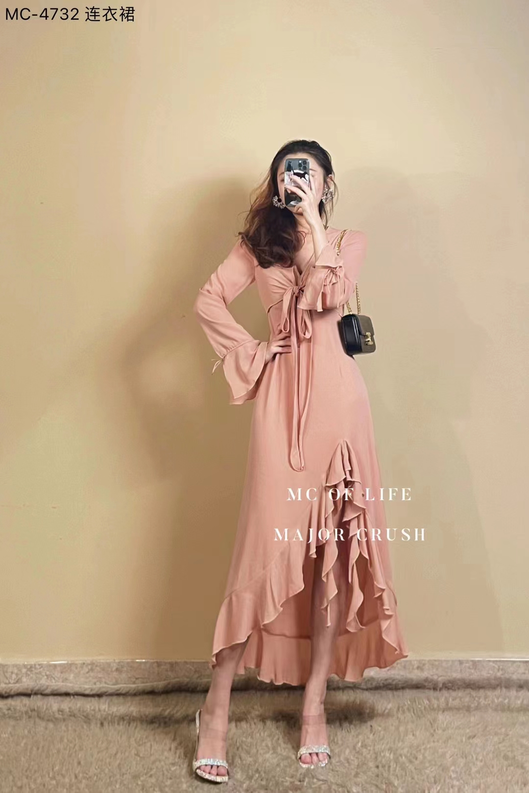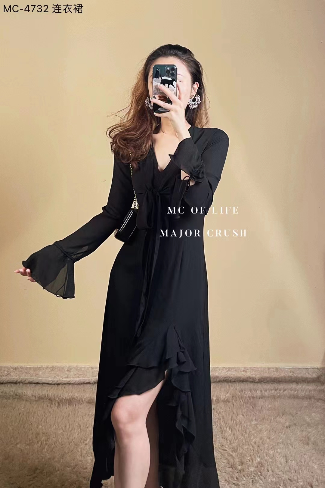 产品名称 | Product name: 超仙垂感木耳边茶歇连衣裙不规则裙摆23年新款小众设计
