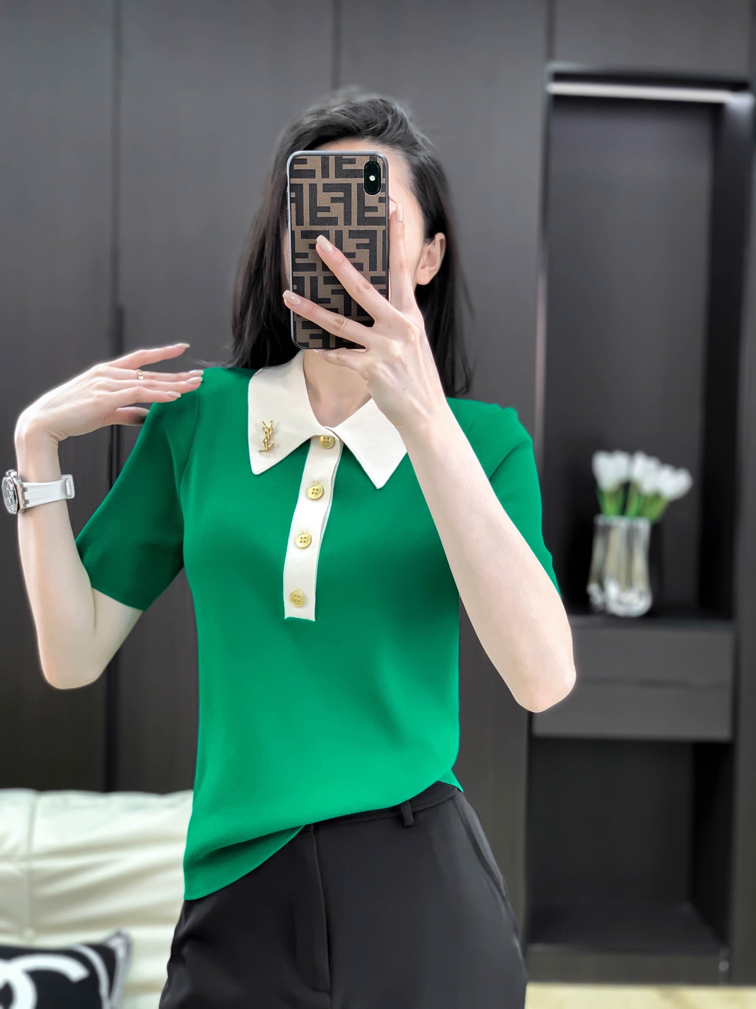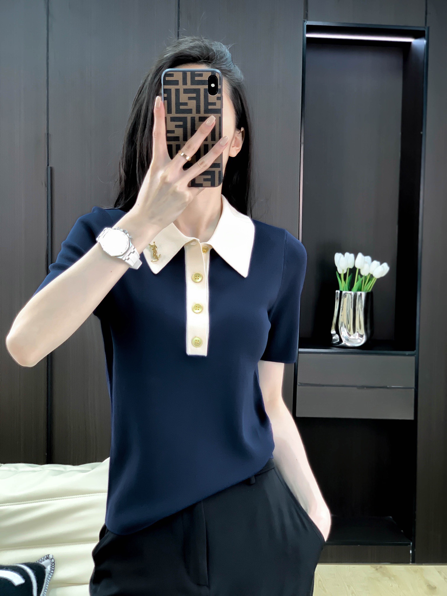 爆款:18é’ˆæžç»†å¤©ä¸çº±å®šåˆ¶YSL胸针撞色领上衣5704#