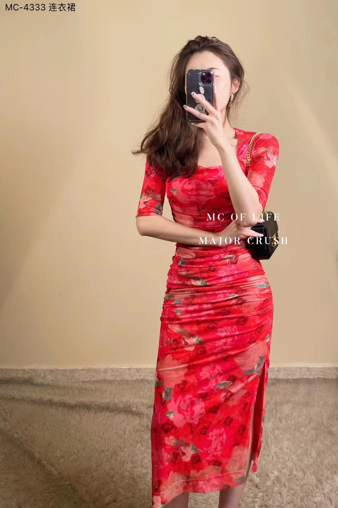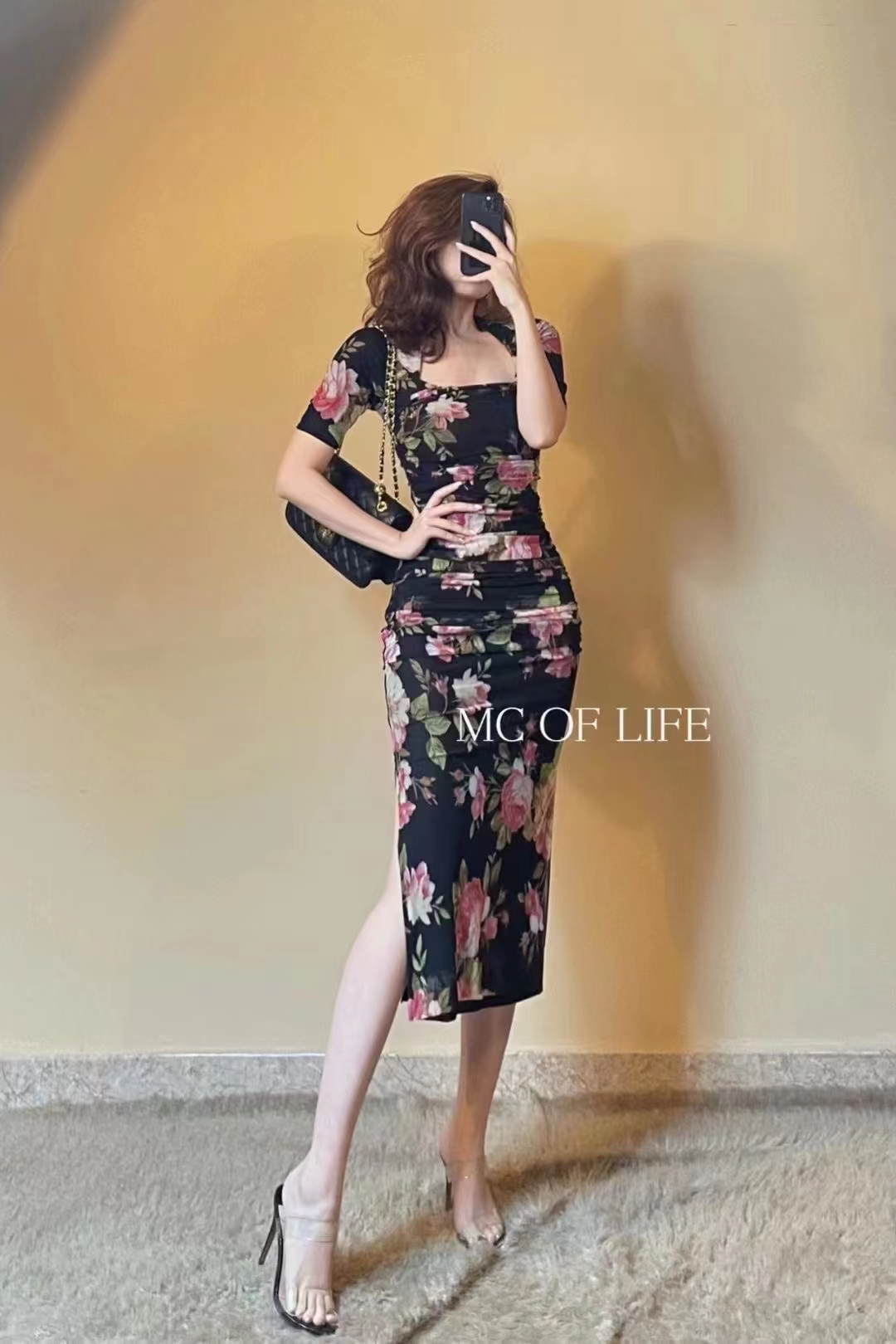 MC超仙春季新款一字领碎花茶歇法式连衣裙23年新款原创小众设计