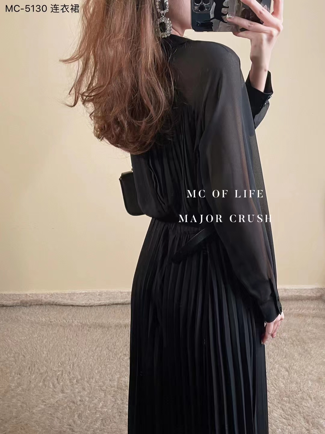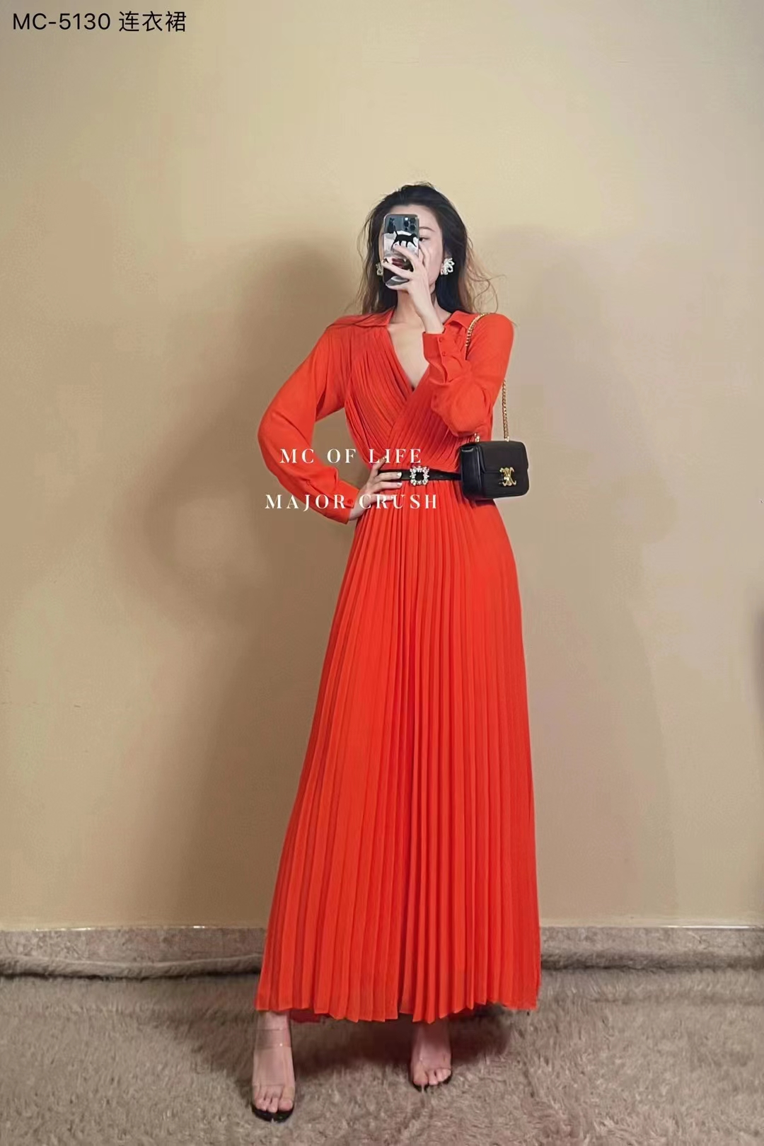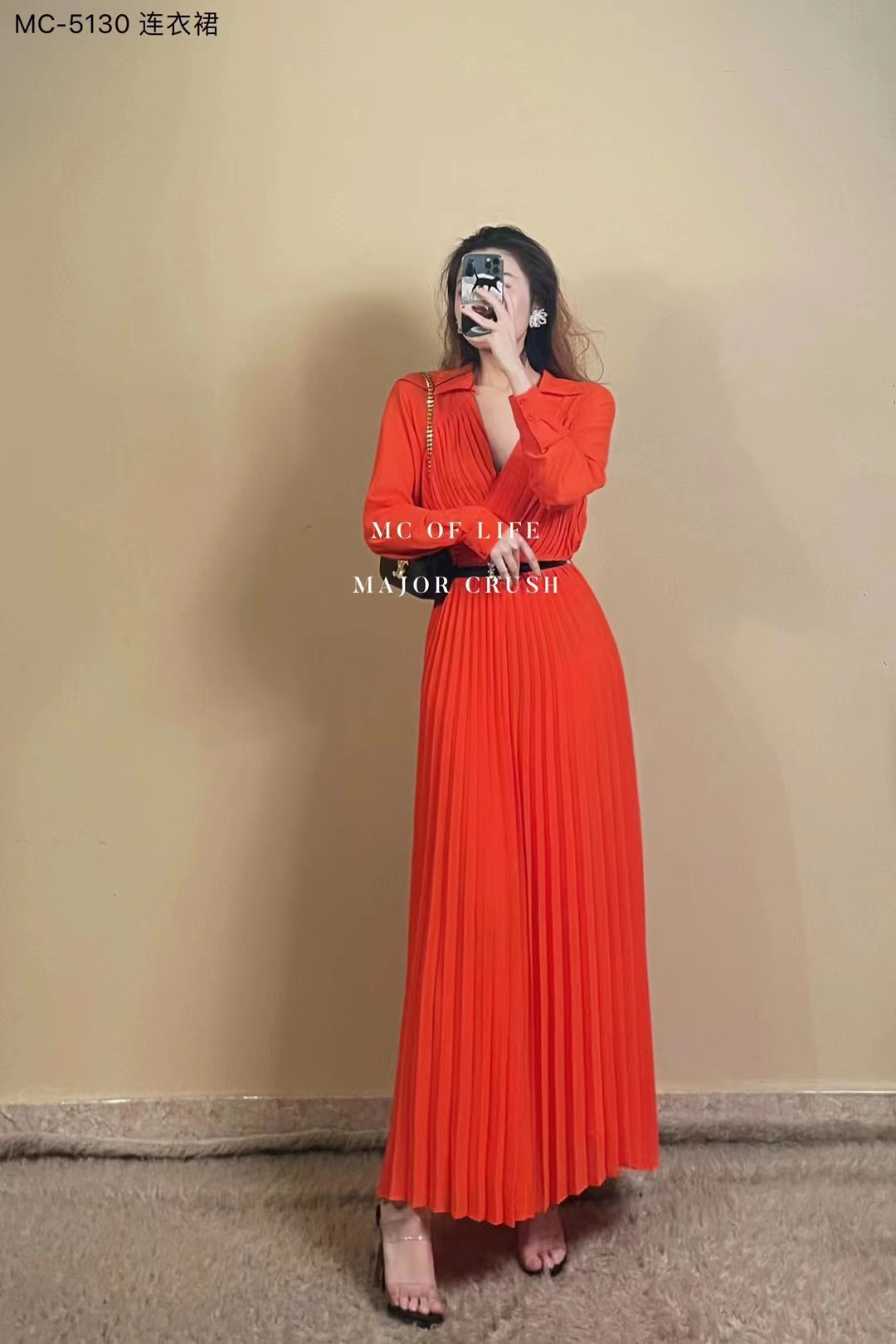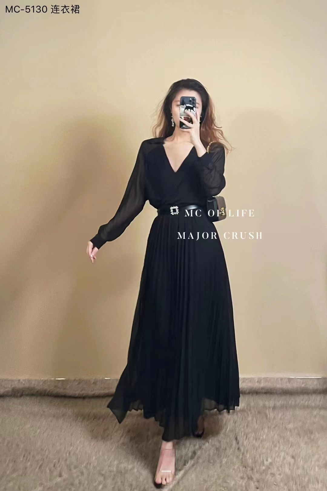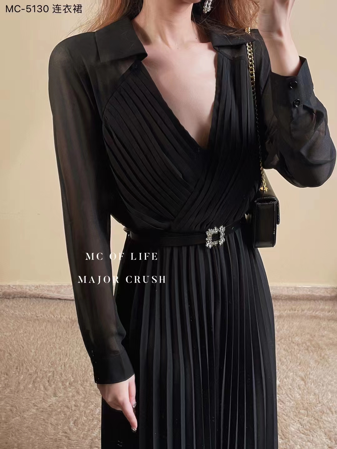 产品名称 | Product name: MC 2023春季新款V领长袖时尚百褶长裙重工气质连衣裙夏