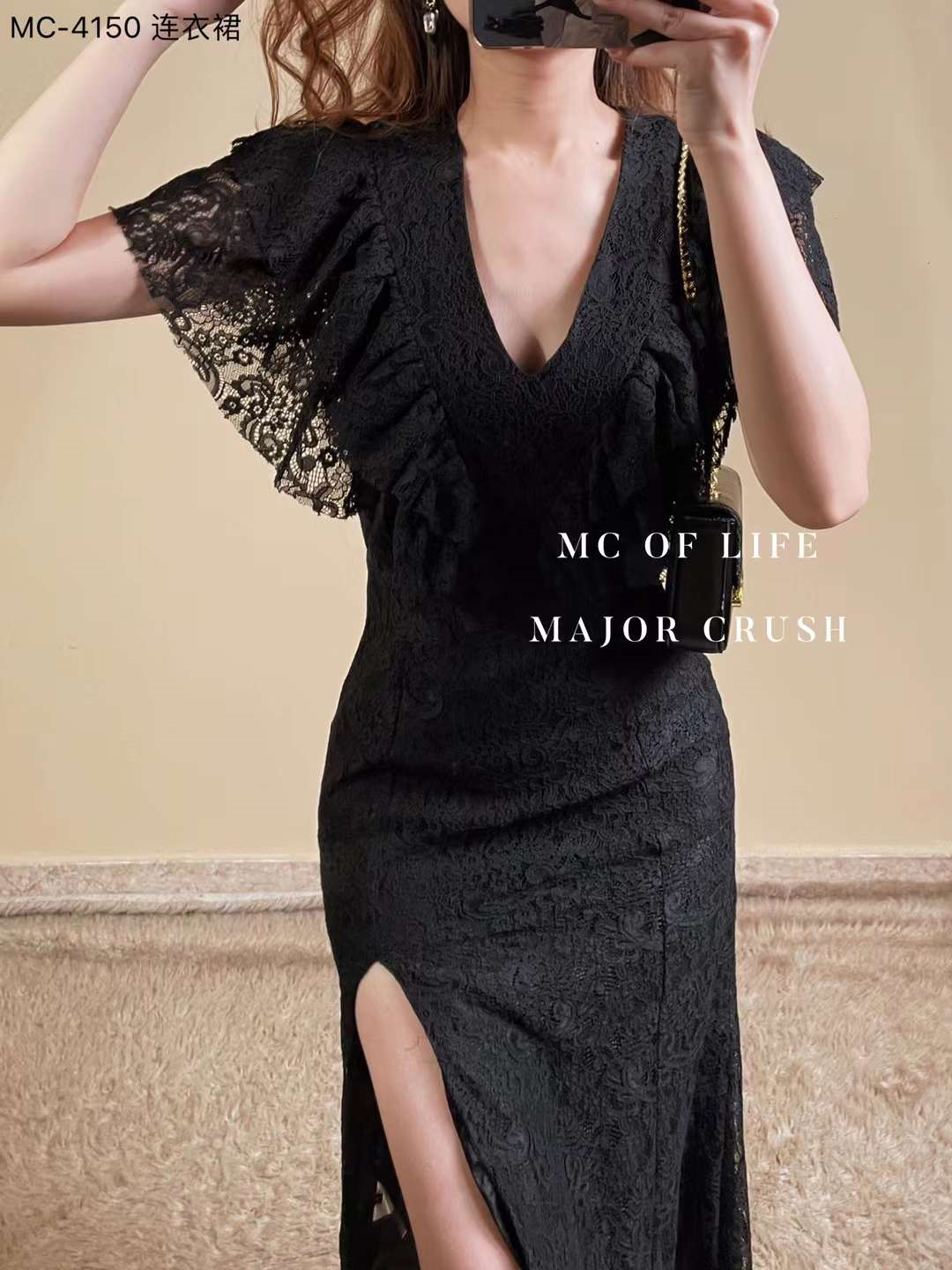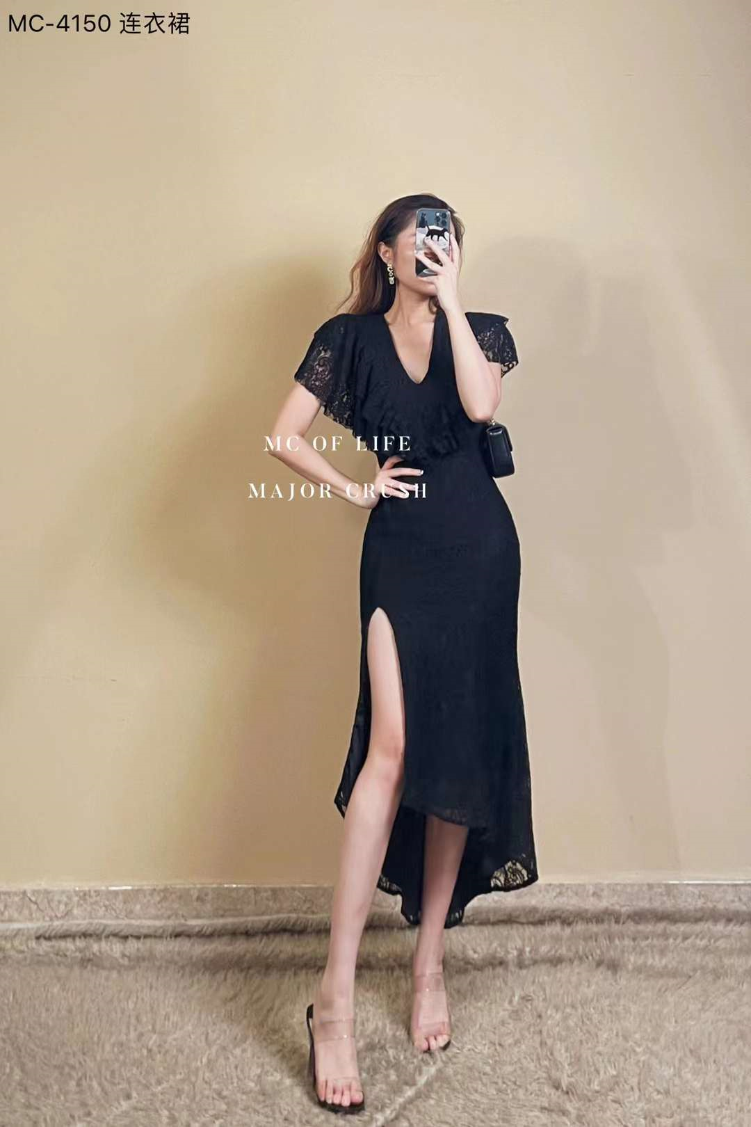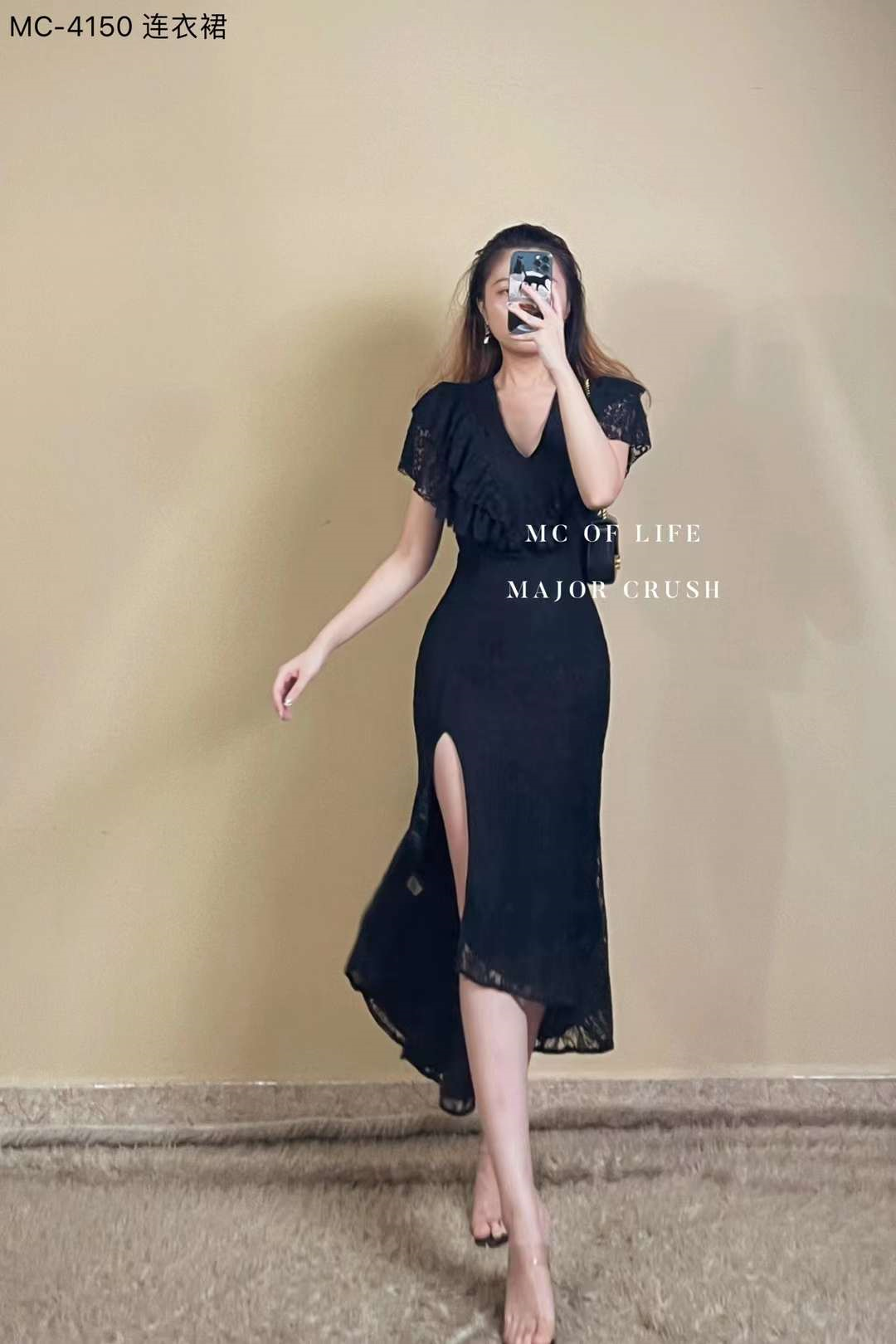 产品名称 | Product name: MC2023夏季新款V领蕾丝花边气质修身显瘦开叉不等边连衣裙女