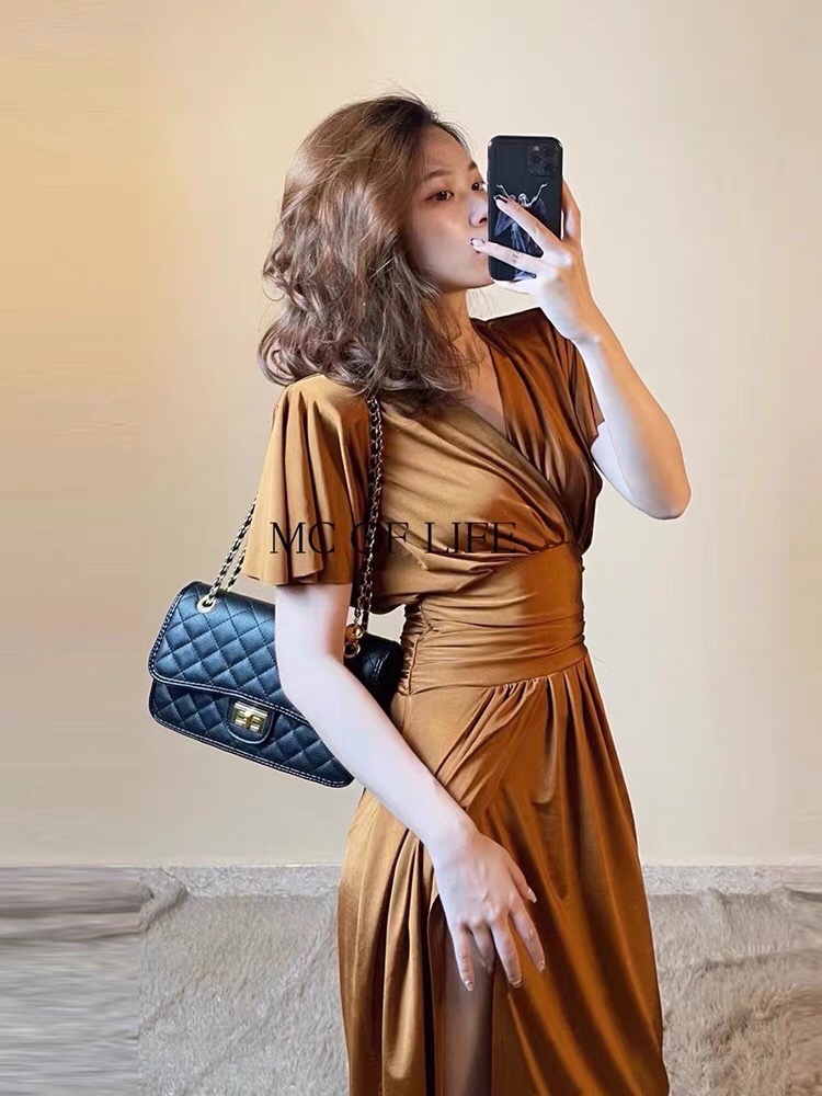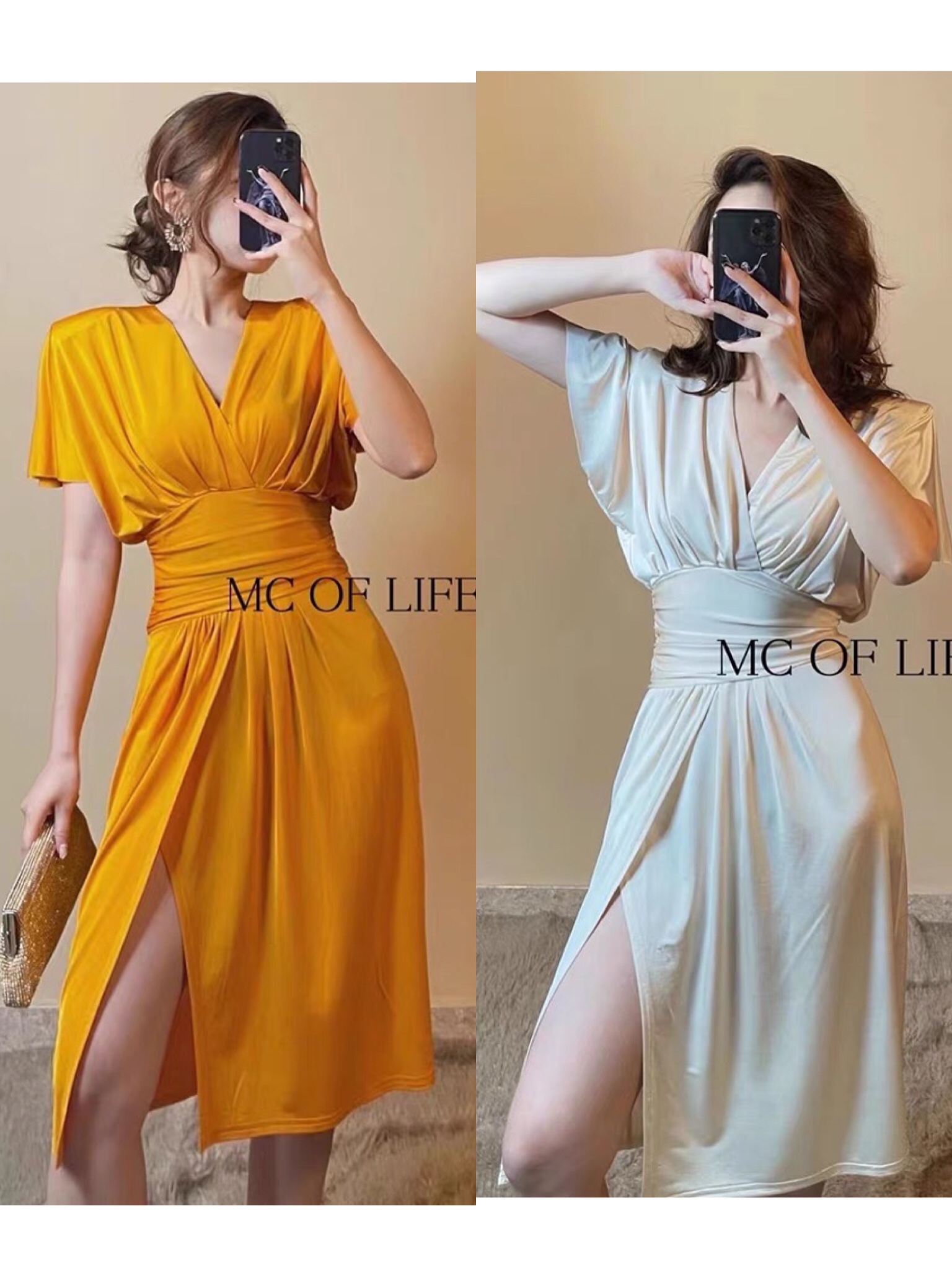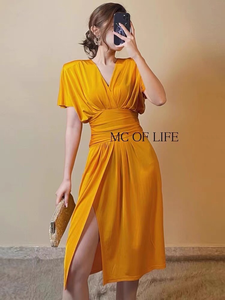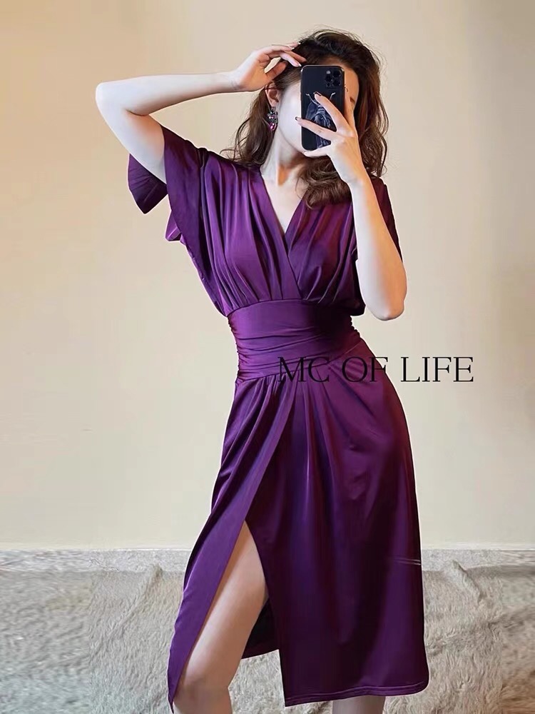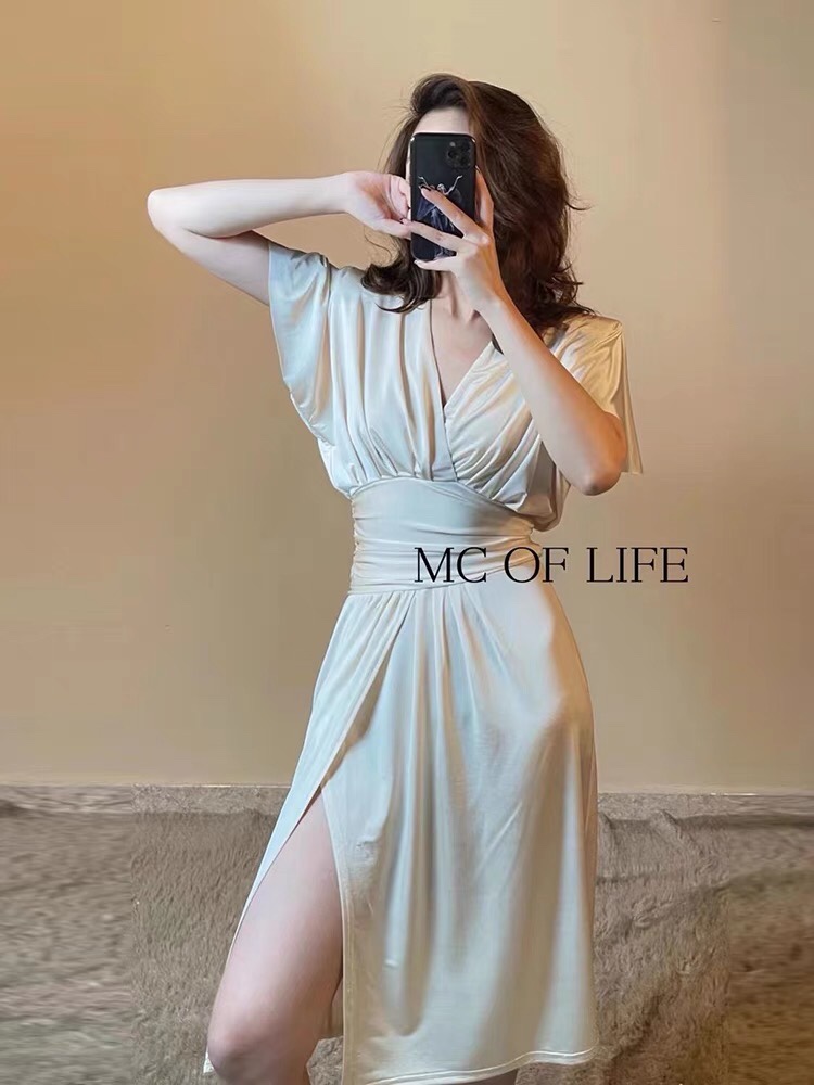 产品名称 | Product name: MC法式V领收腰开叉连衣裙女气质显瘦