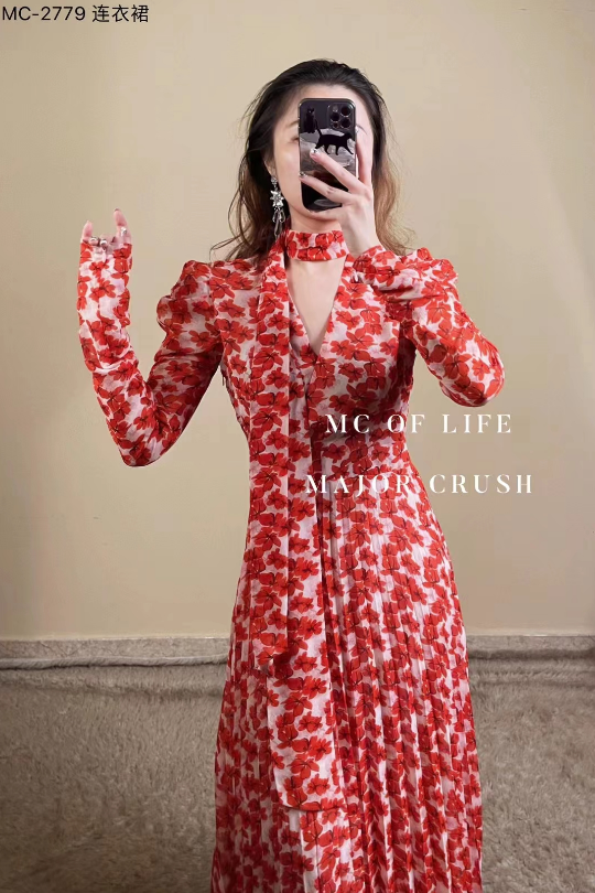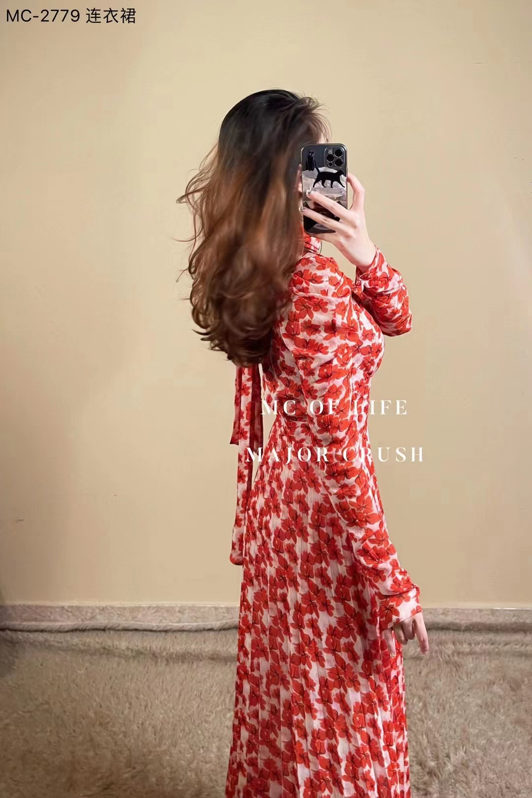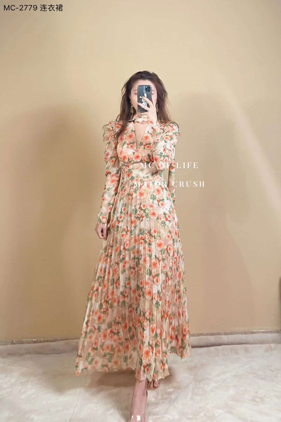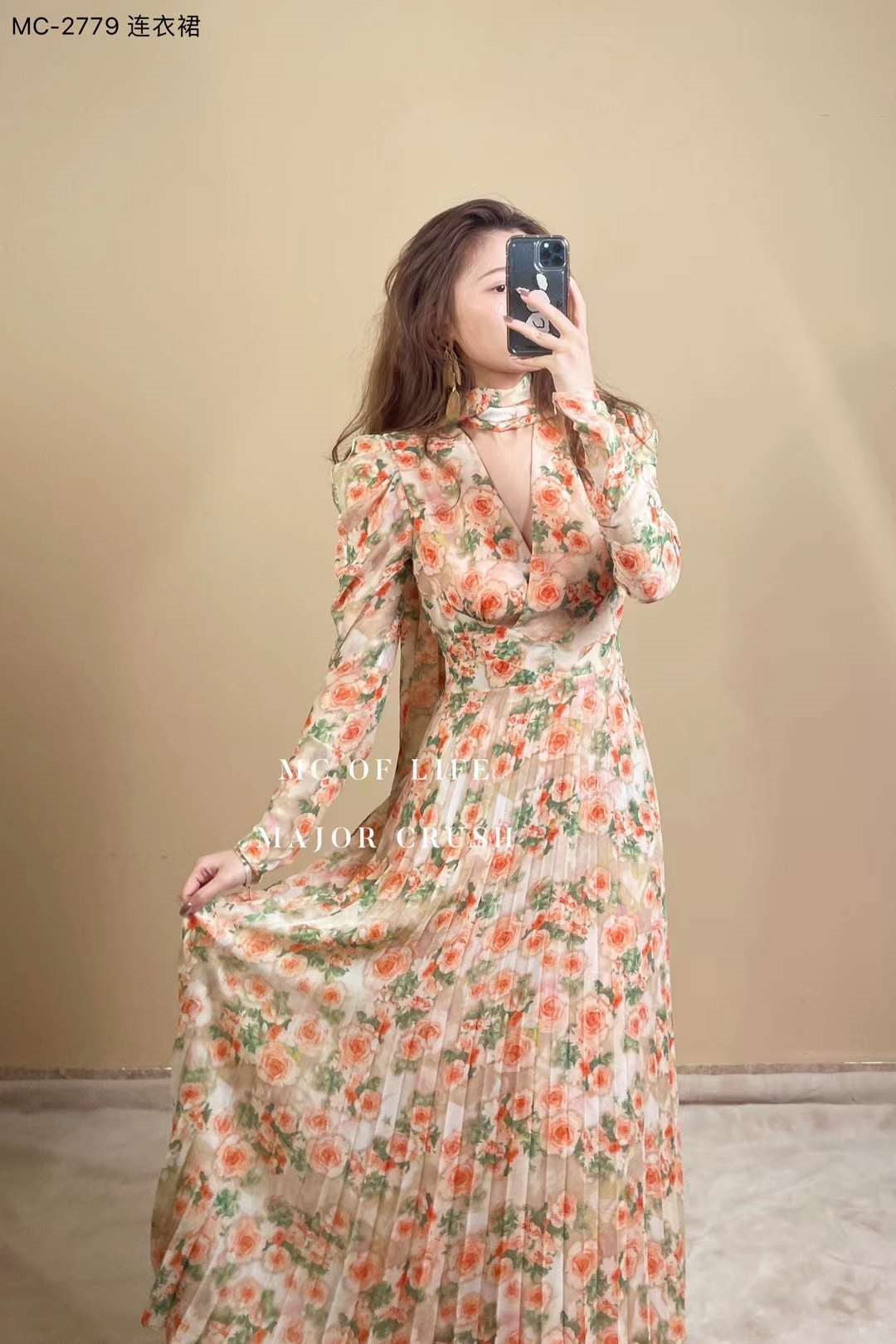 产品名称 | Product name: MC原创设计师 2023早春新款女装气质高雅印花真丝百褶连衣裙