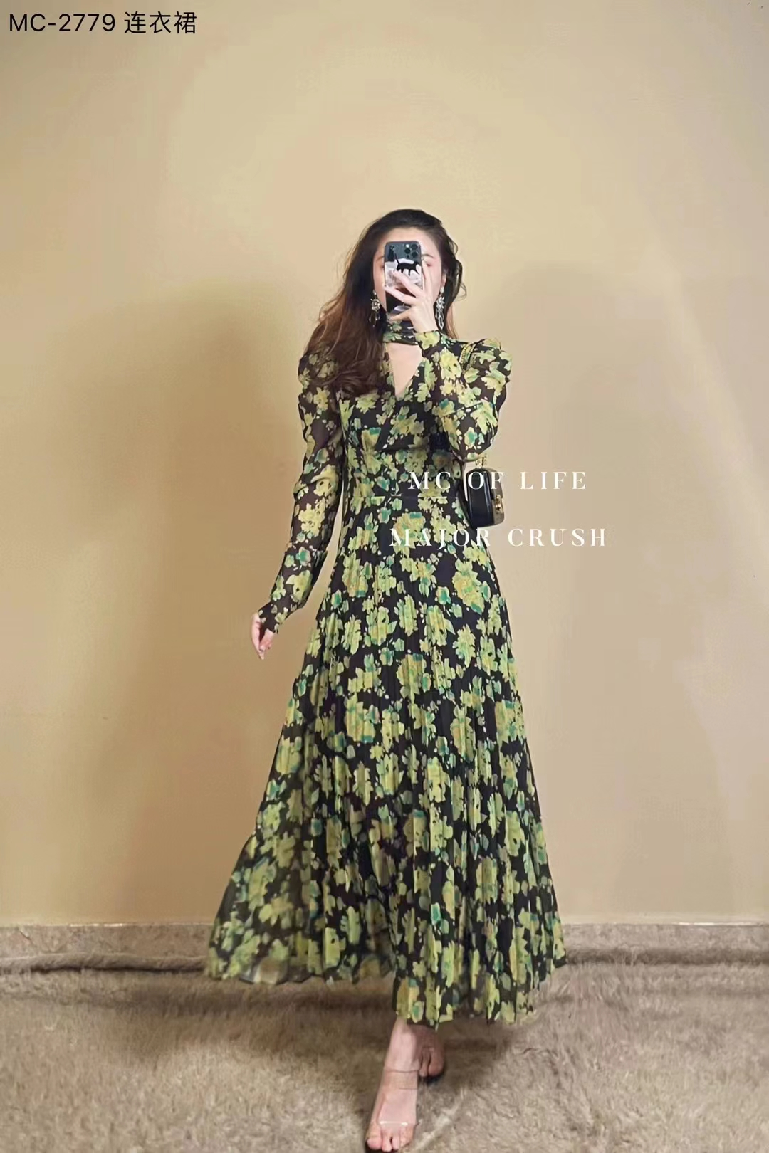 MC原创设计师 2023早春新款女装气质高雅印花真丝百褶连衣裙