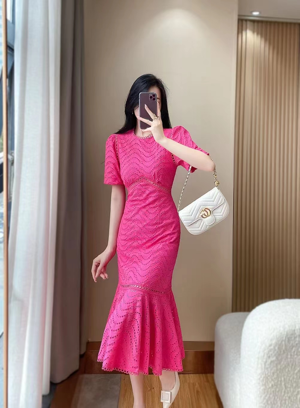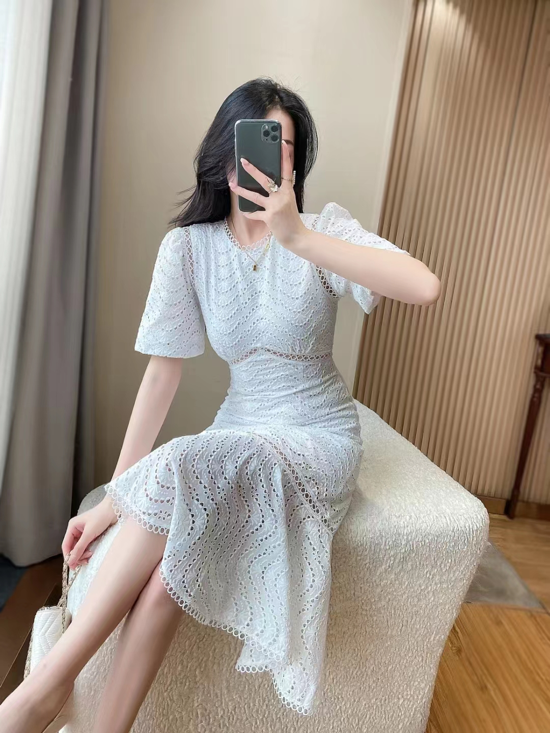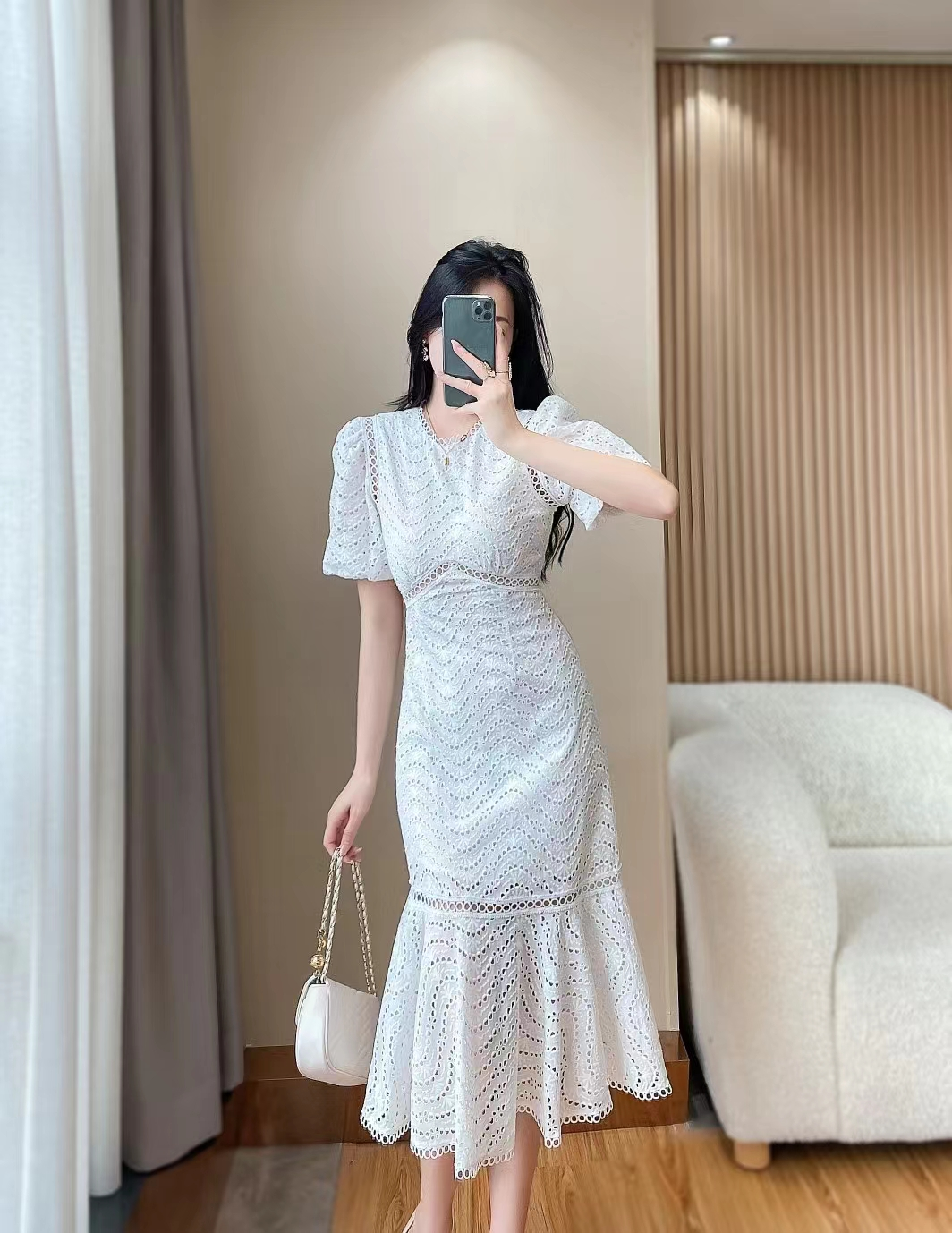 产品名称 | Product name: DIOR 水溶蕾丝泡泡袖修身显瘦波浪蕾丝包臀鱼尾连衣裙女