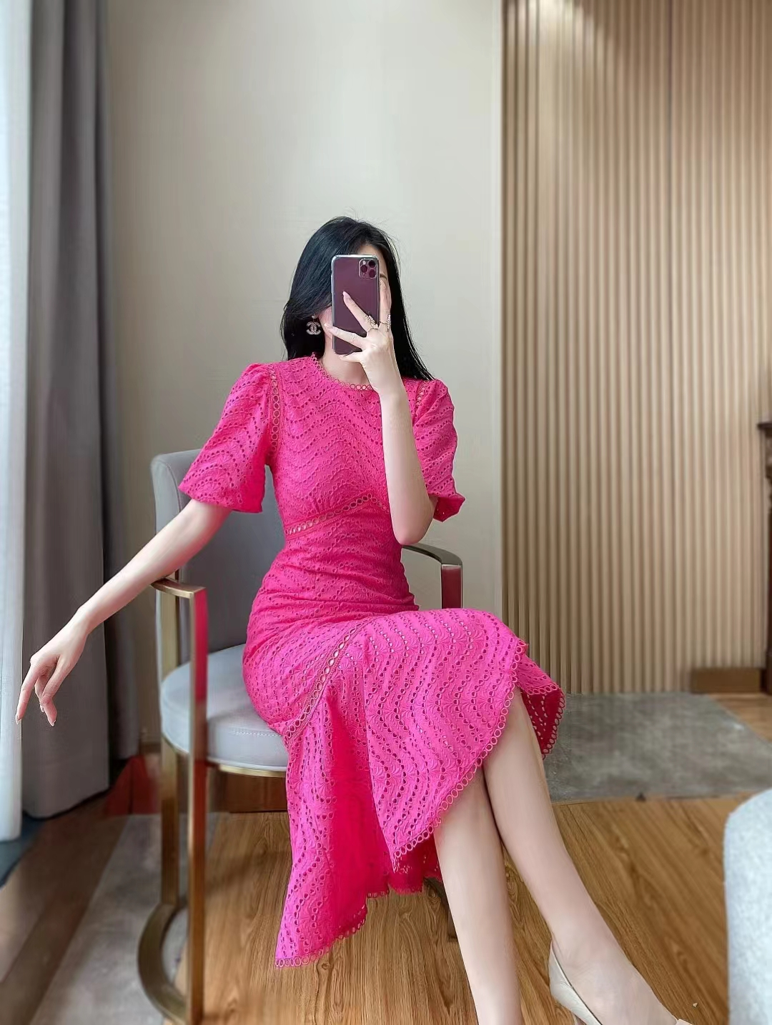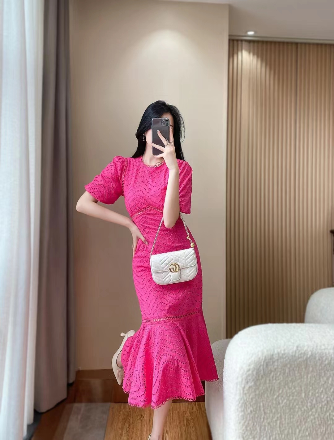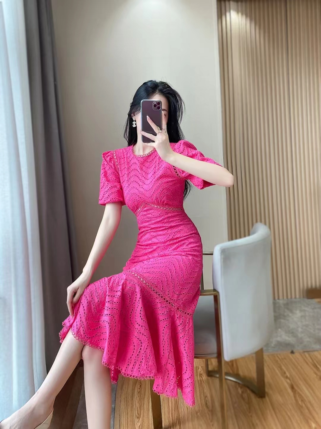 产品名称 | Product name: DIOR 水溶蕾丝泡泡袖修身显瘦波浪蕾丝包臀鱼尾连衣裙女