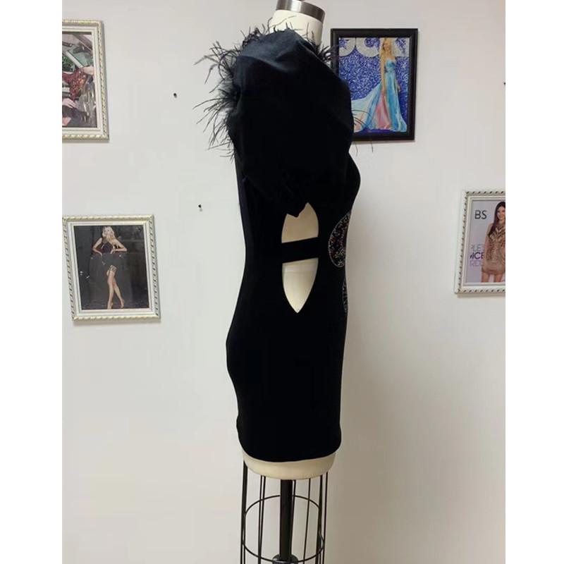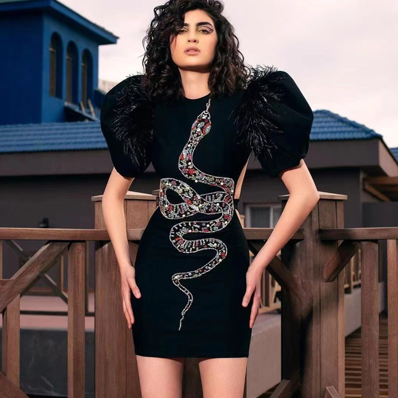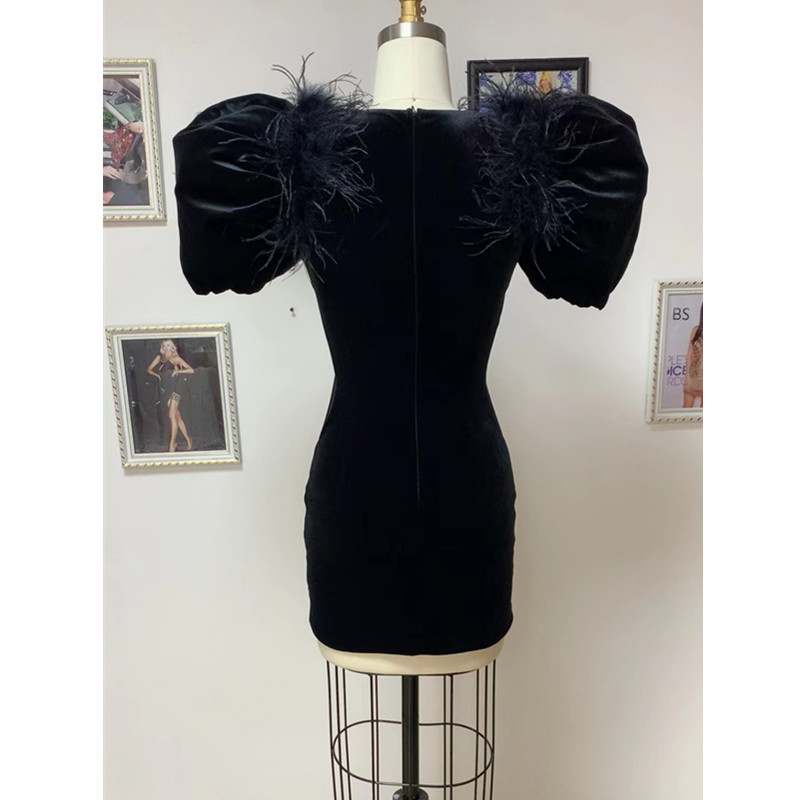 产品名称 | Product name: 黑色丝绒蛇型烫钻羽毛短袖修身连衣裙气质名缓交际小礼服