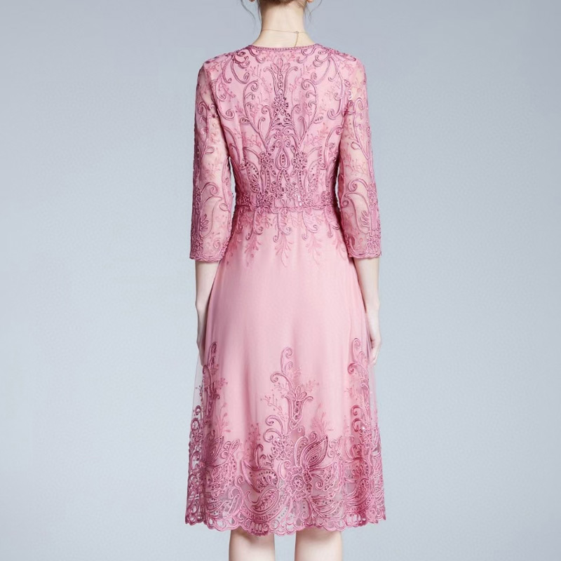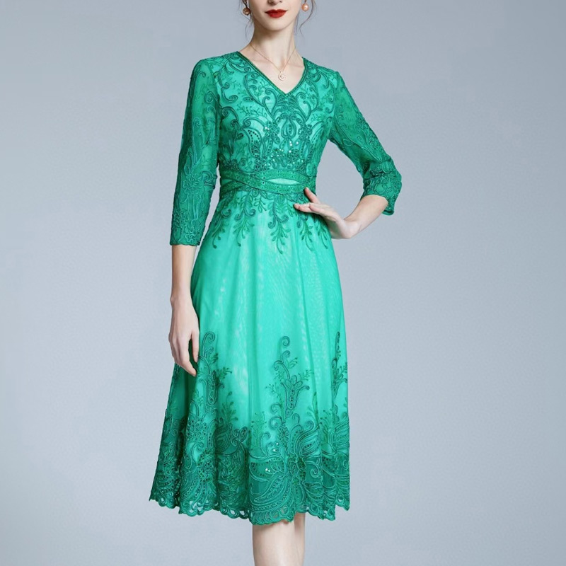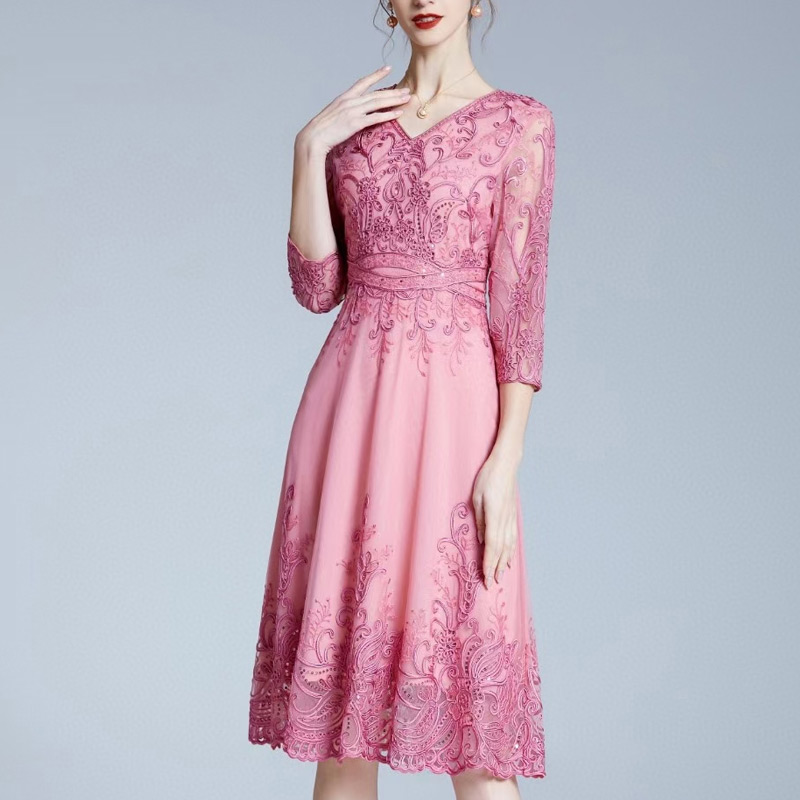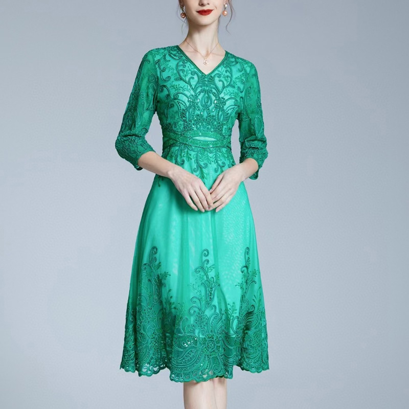 夏季新款重工盘花网纱刺绣V领收腰别致连衣裙