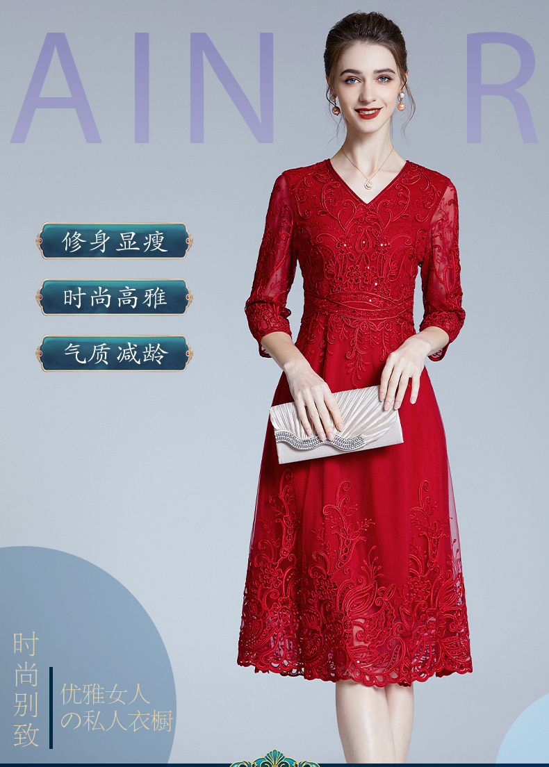 高贵V领喜妈妈婚宴装礼服 中长款网纱刺绣年轻喜婆婆婚礼连衣裙夏