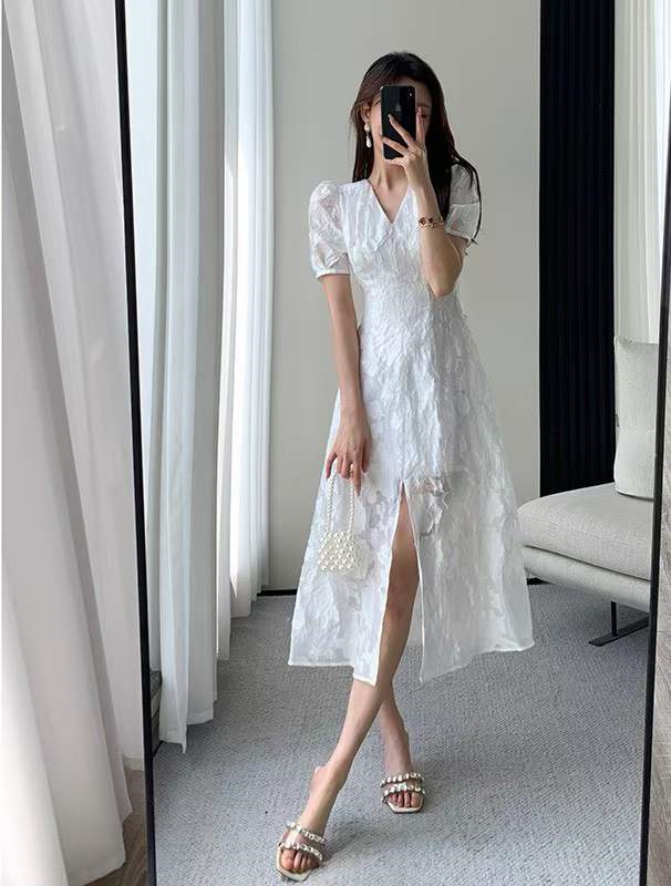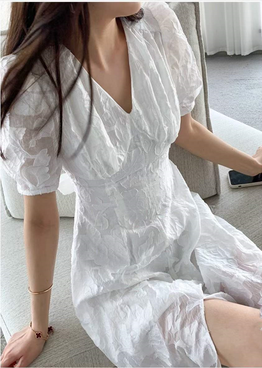 产品名称 | Product name: 2023重工定制立体浮雕法式V领开叉气质收腰白色连衣裙