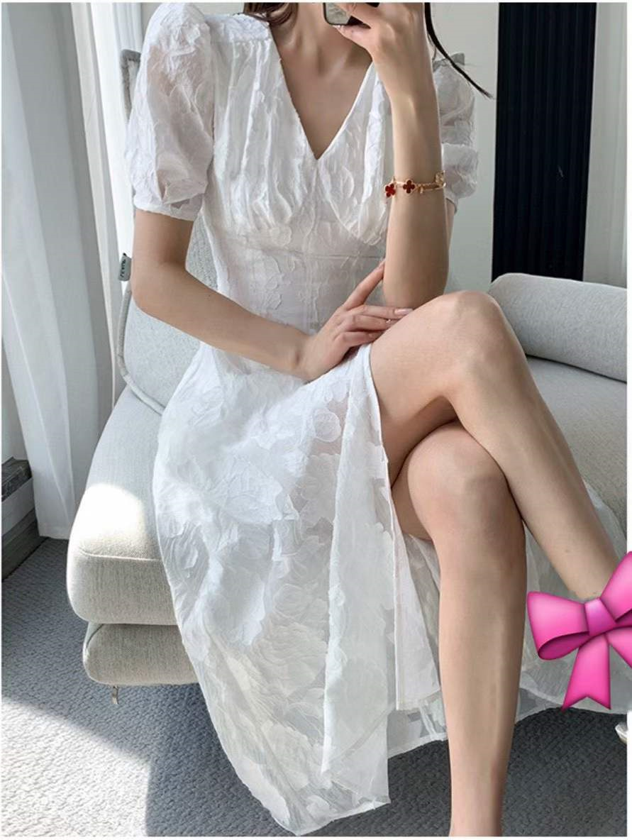 抢货爆款!立体浮雕尽显高级感!重工定制立体剪花  æ³•式V领开叉气质收腰白色连衣裙SMLXL