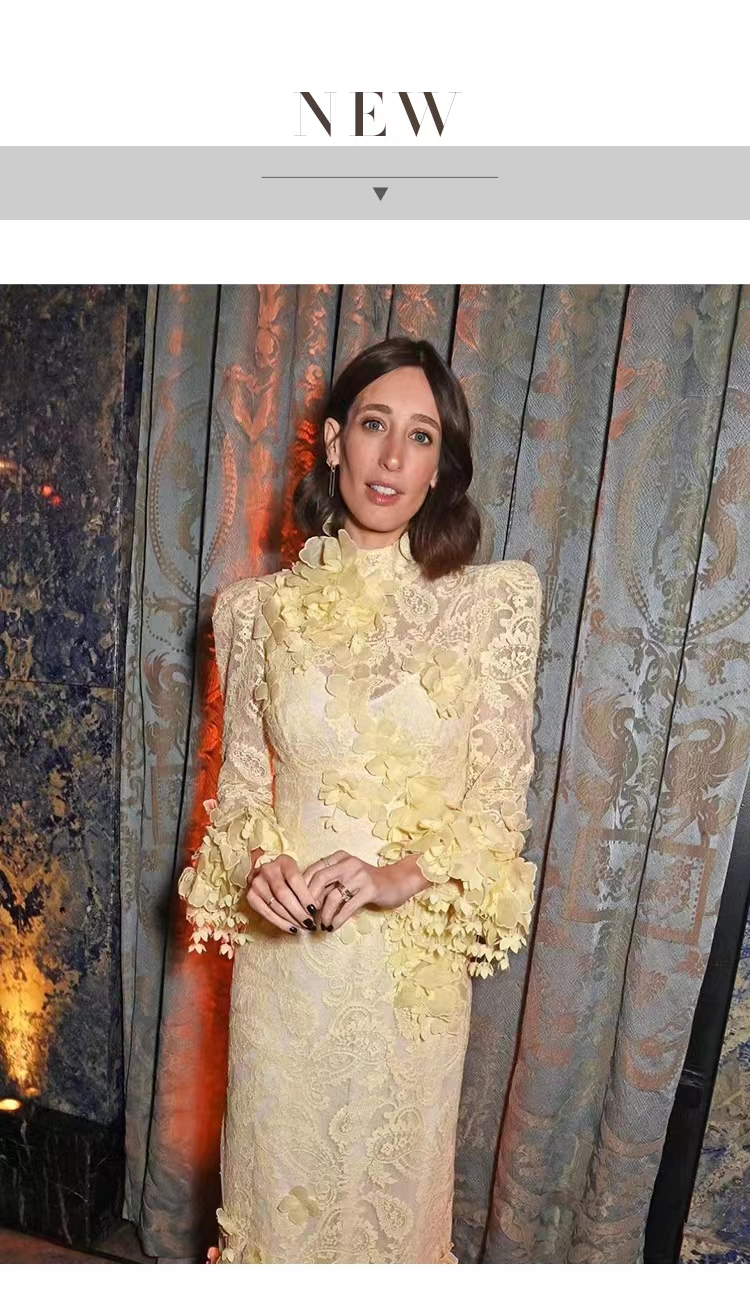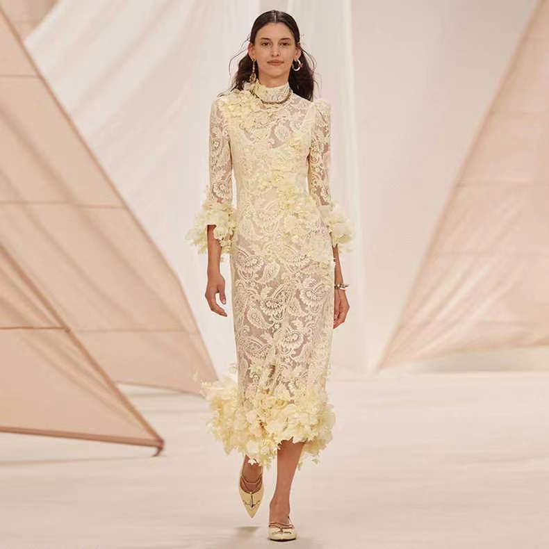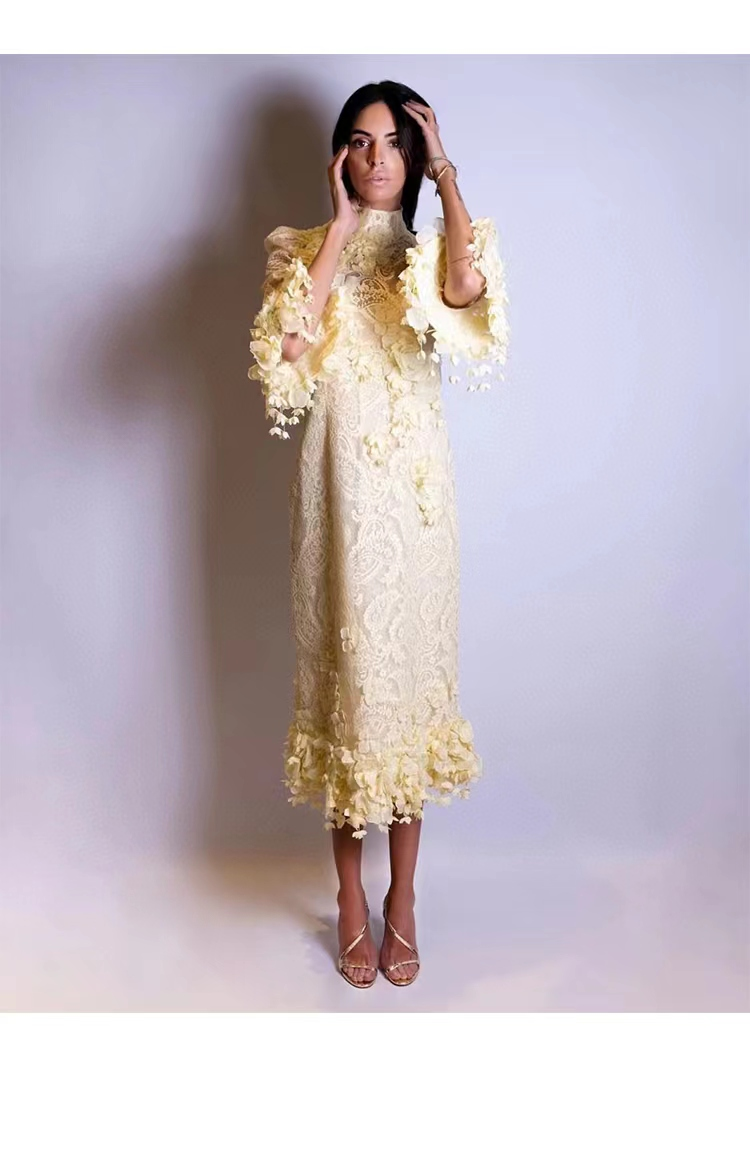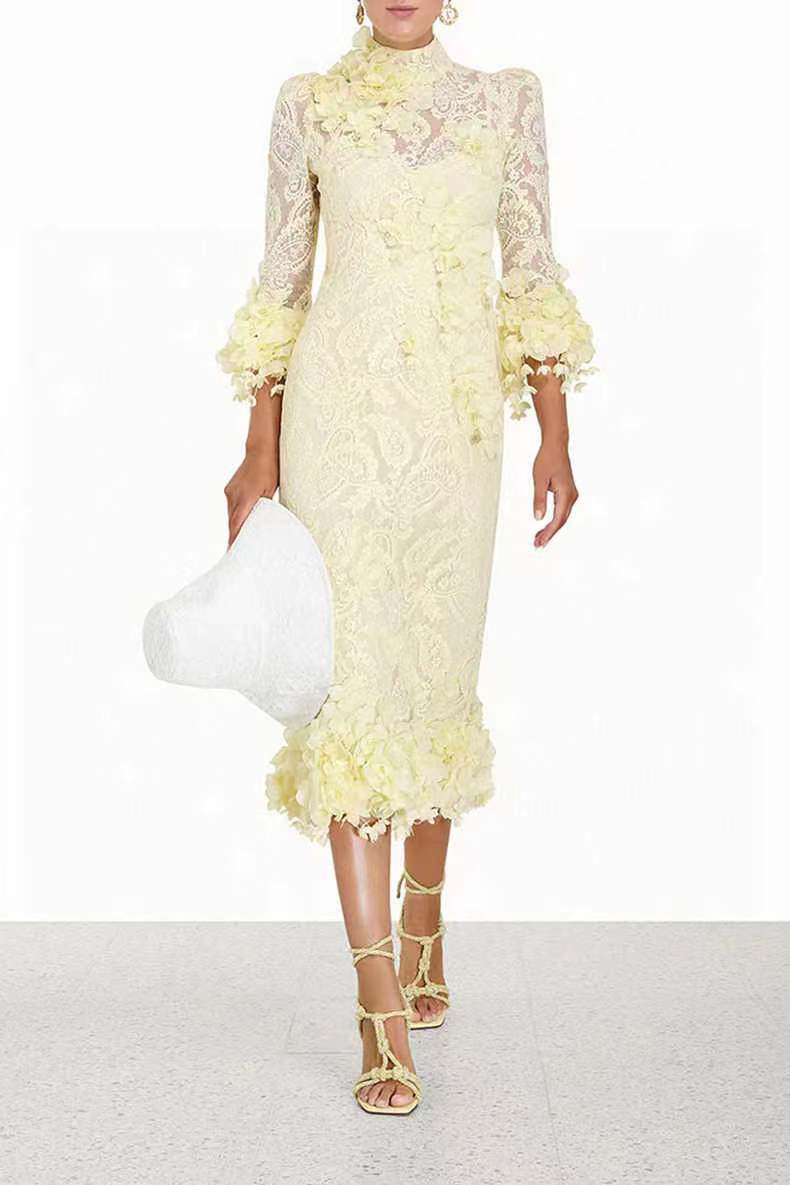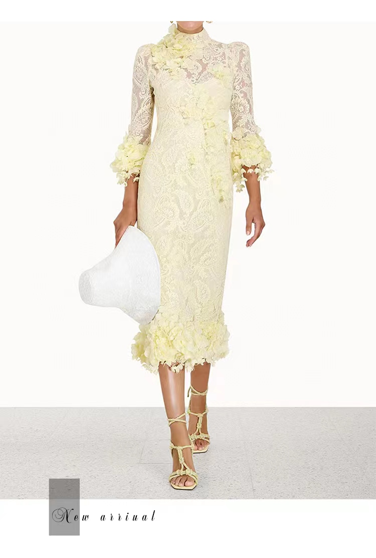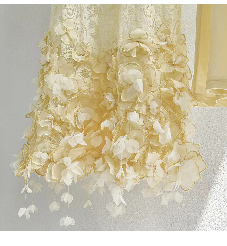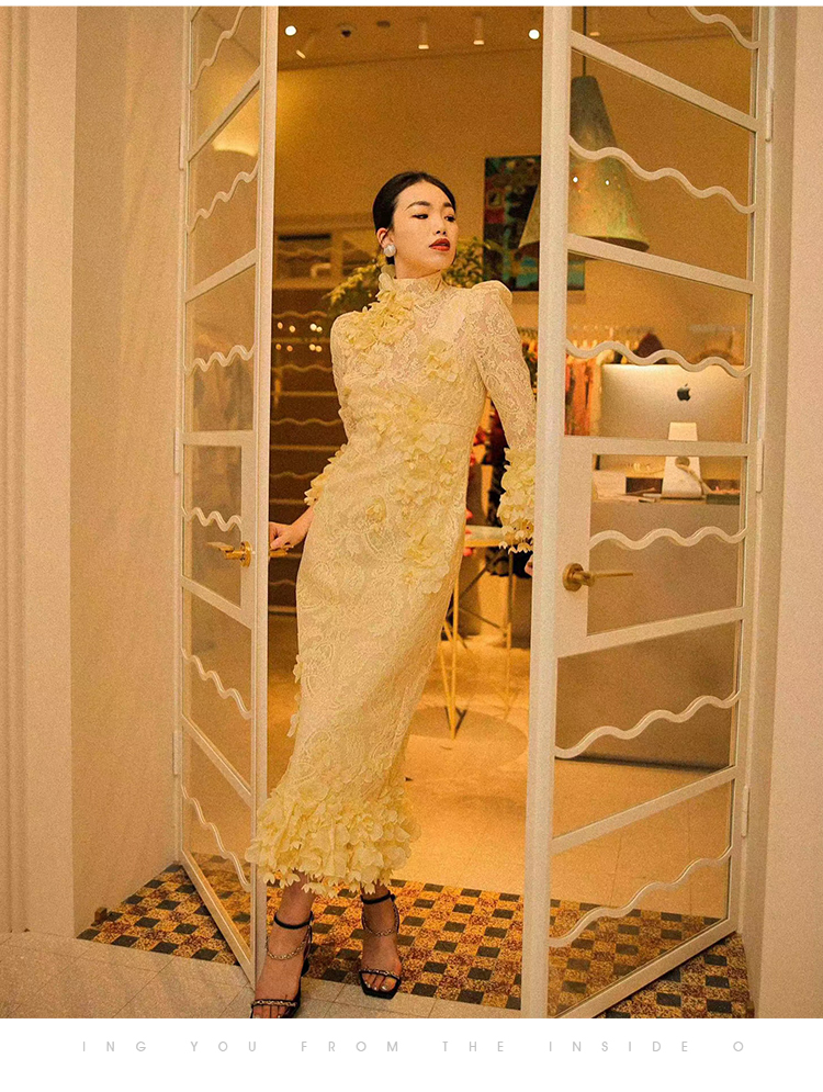 2023春夏新款轻奢名媛气质黄色蕾丝立体花朵修身长款连衣裙礼服长