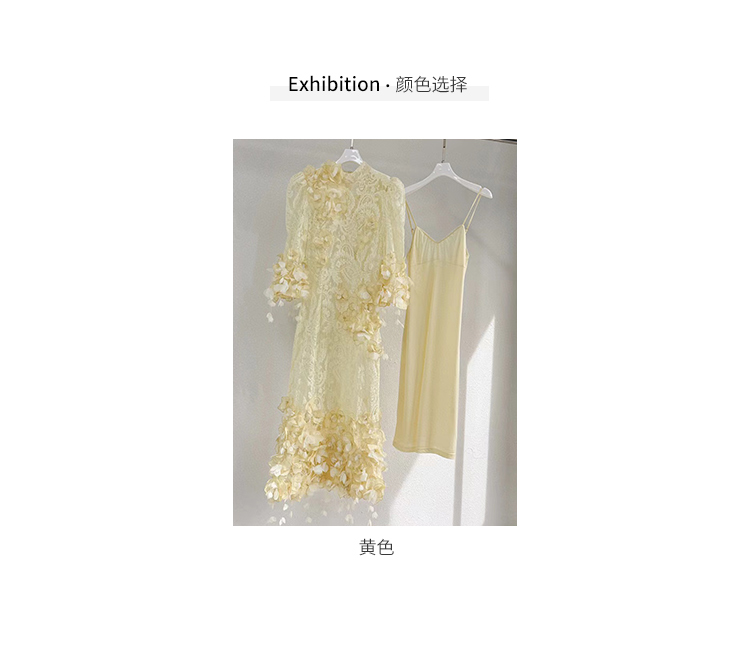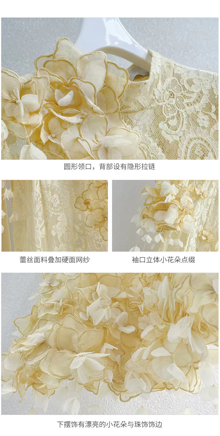产品名称 | Product name: 2023春夏新款轻奢名媛气质黄色蕾丝立体花朵修身长款连衣裙礼服长