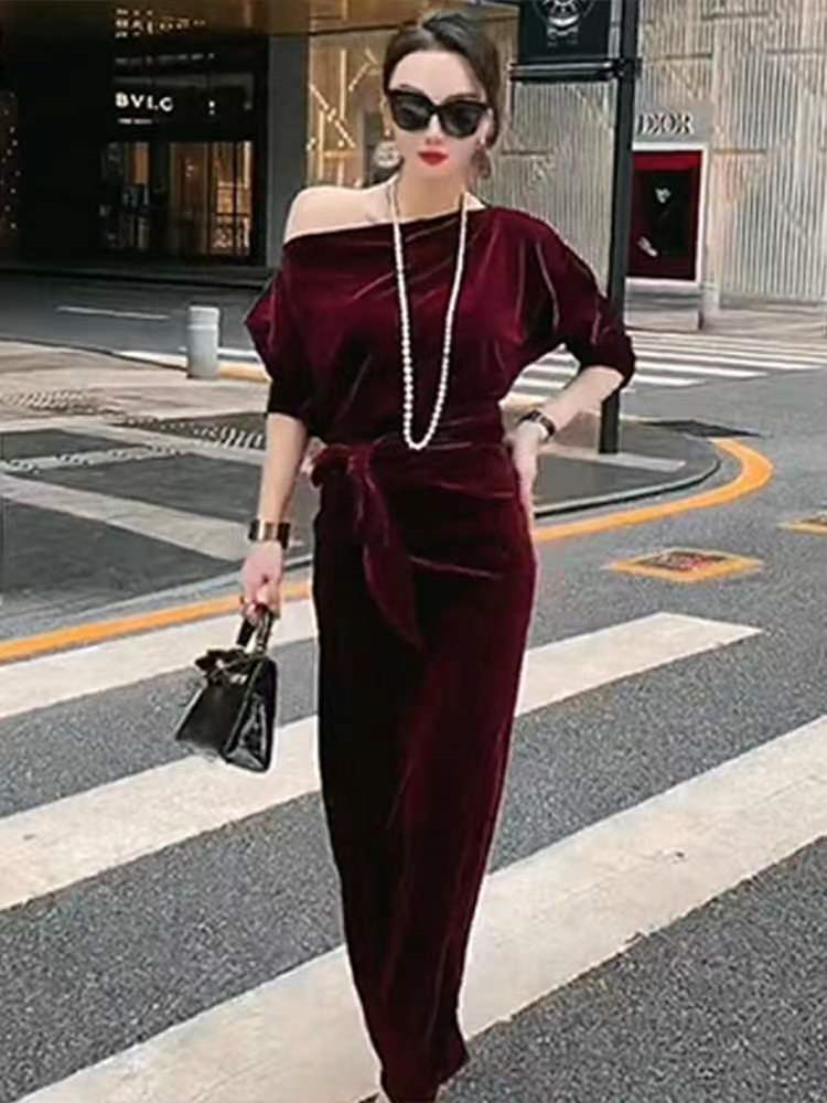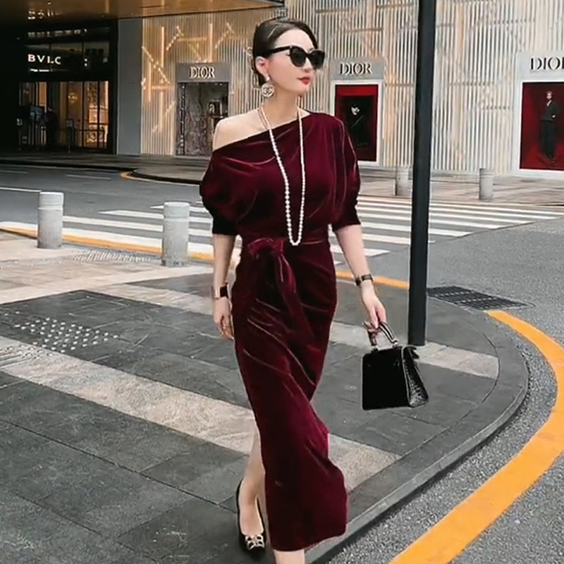 产品名称 | Product name: 丝绒棕色长裙早春季2023新款法式复古轻奢赫本风高级感收腰连衣裙