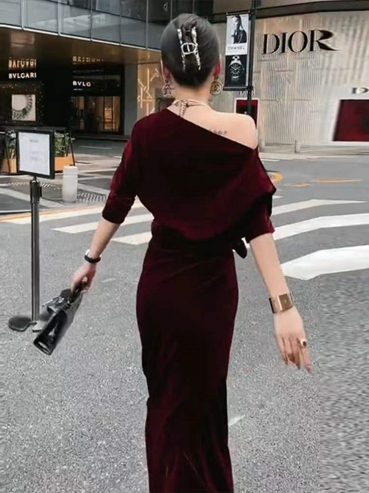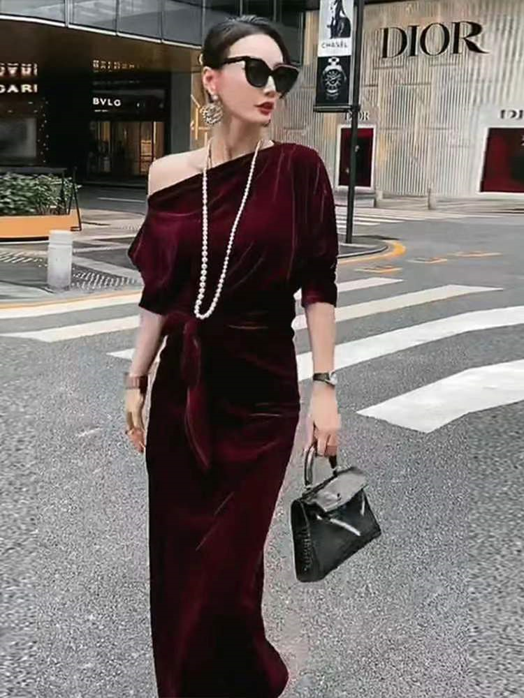 丝绒棕色长裙早春季2023新款法式复古轻奢赫本风高级感收腰连衣裙