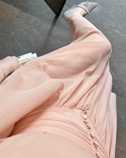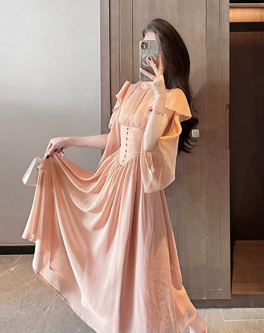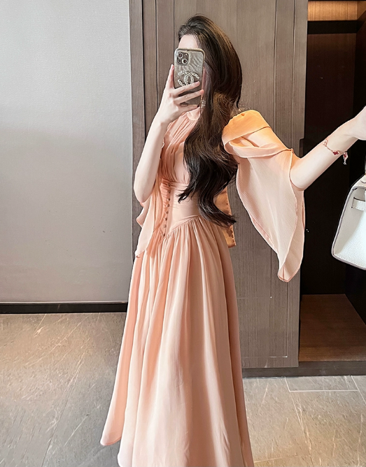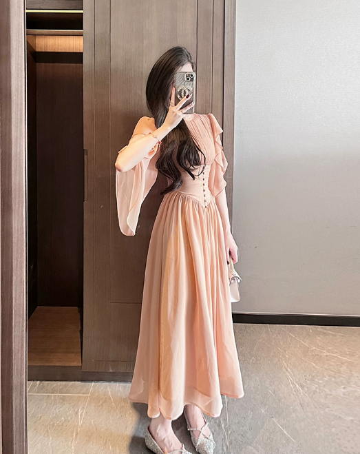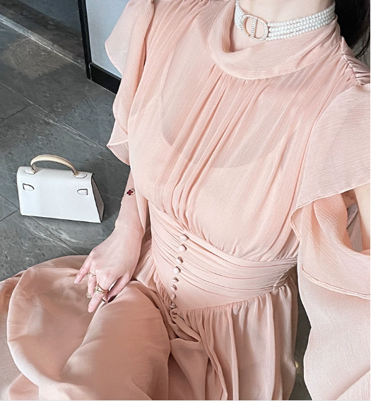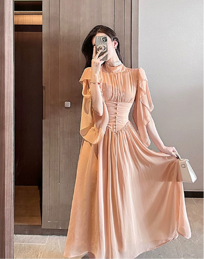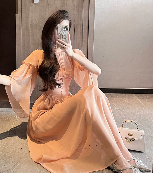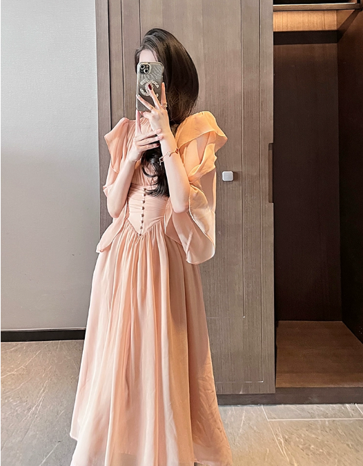 杏色雪纺连衣裙女夏季长裙2023年新款气质高级感在逃公主裙子礼服