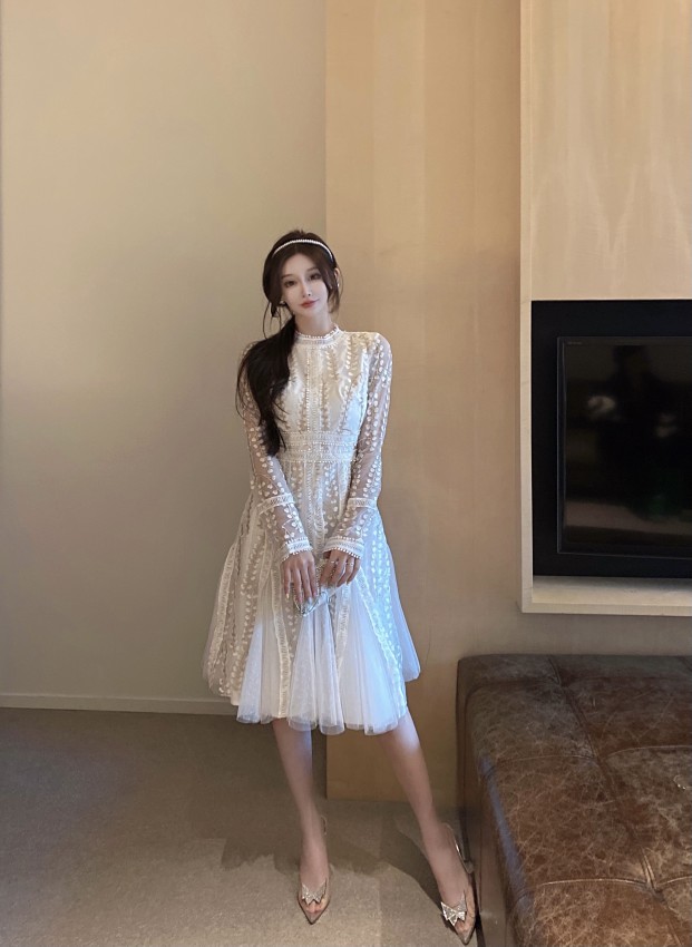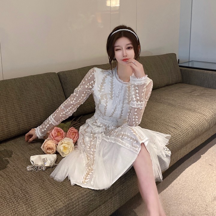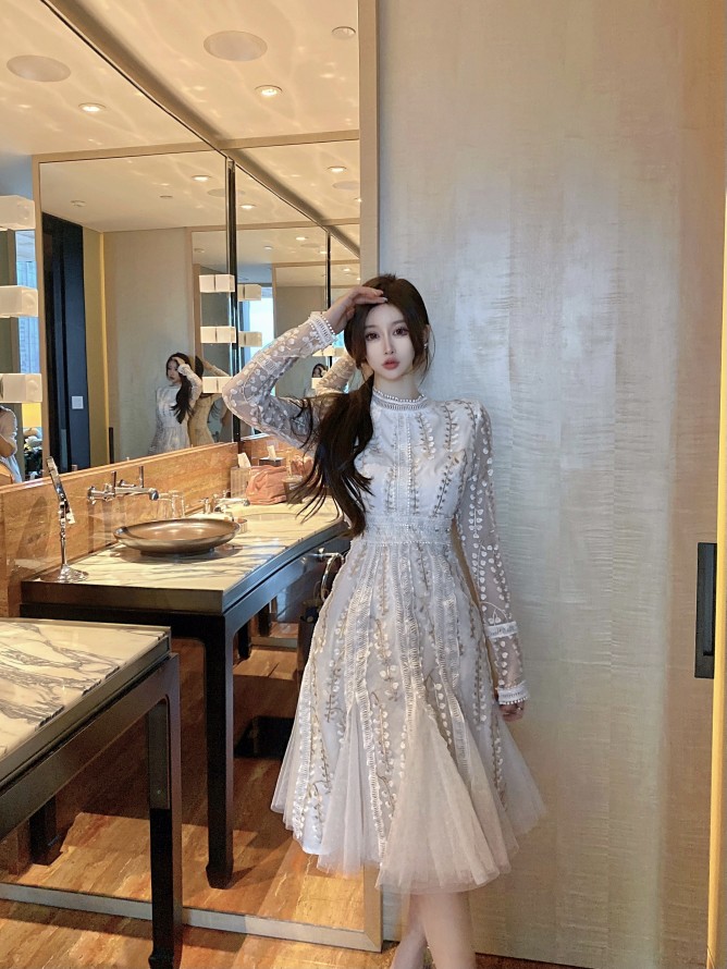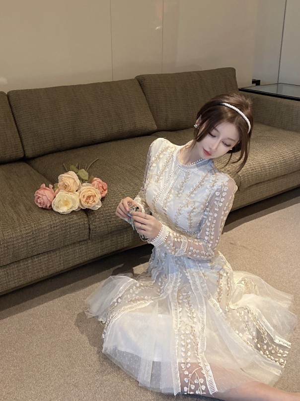 产品名称 | Product name: 2023春季新款欧美重工礼服裙收腰长裙网纱刺绣拼接水溶名媛连衣裙