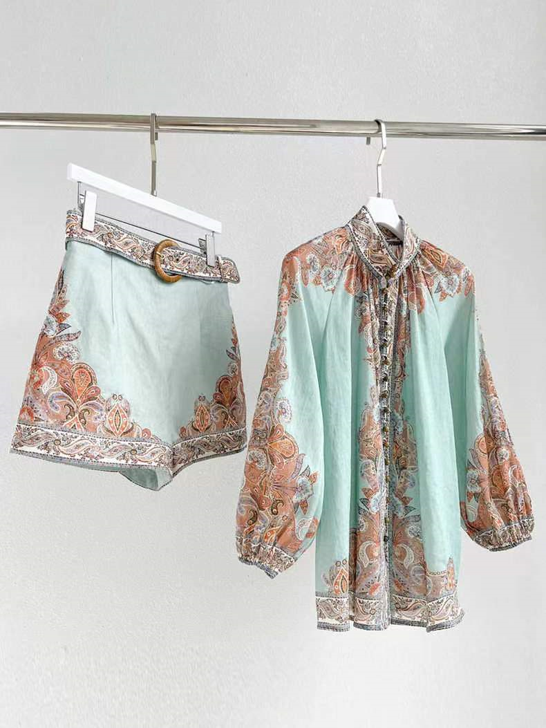 产品名称 | Product name: CiCili小众 2023年夏季新款苎麻定位印花立领灯笼袖衬衣+短裤套装
