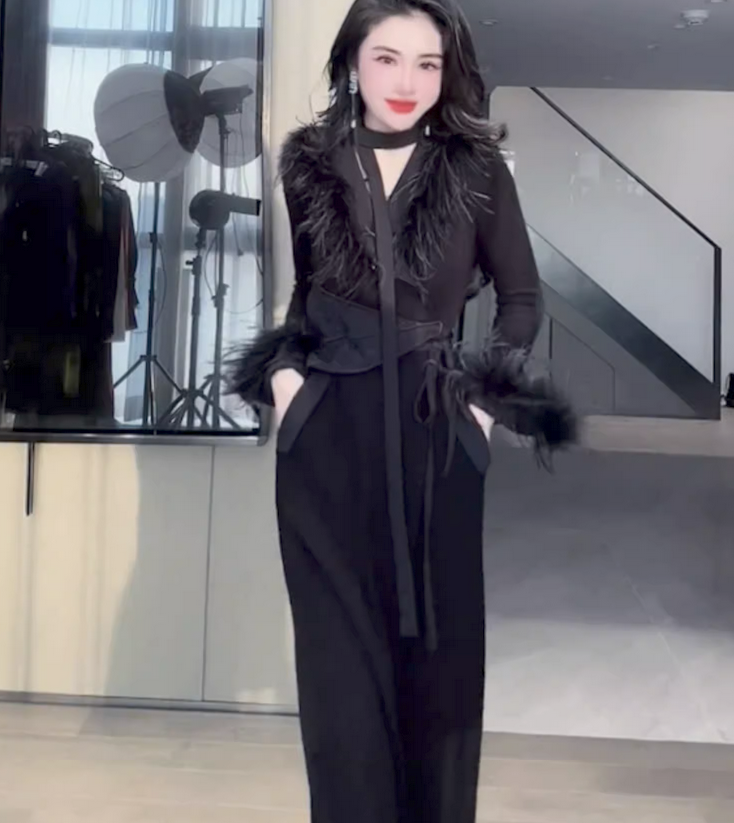 RESALE 2023早秋新款高冷御姐风收腰显瘦复古黑色鸵鸟毛针织连衣裙女修身