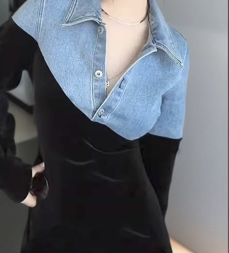 2023秋季新款老钱风修身网红爆款牛仔拼接黑色金丝绒连衣裙子女装