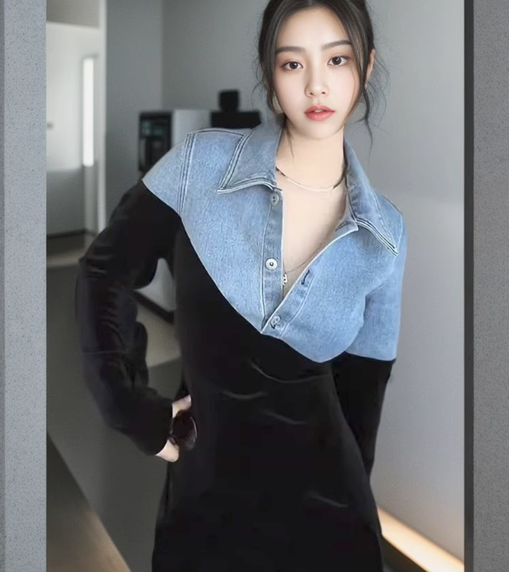 产品名称 | Product name: 2023秋季新款老钱风修身网红爆款牛仔拼接黑色金丝绒连衣裙子女装