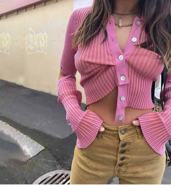 不规则针织衫欧美街头纯色可拆卸长袖女秋冬性感修身单排纽扣毛衣