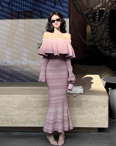 STRIVE/尤美子微胖mm法式一字肩荷叶边包臀裙秋女纯欲针织鱼尾裙