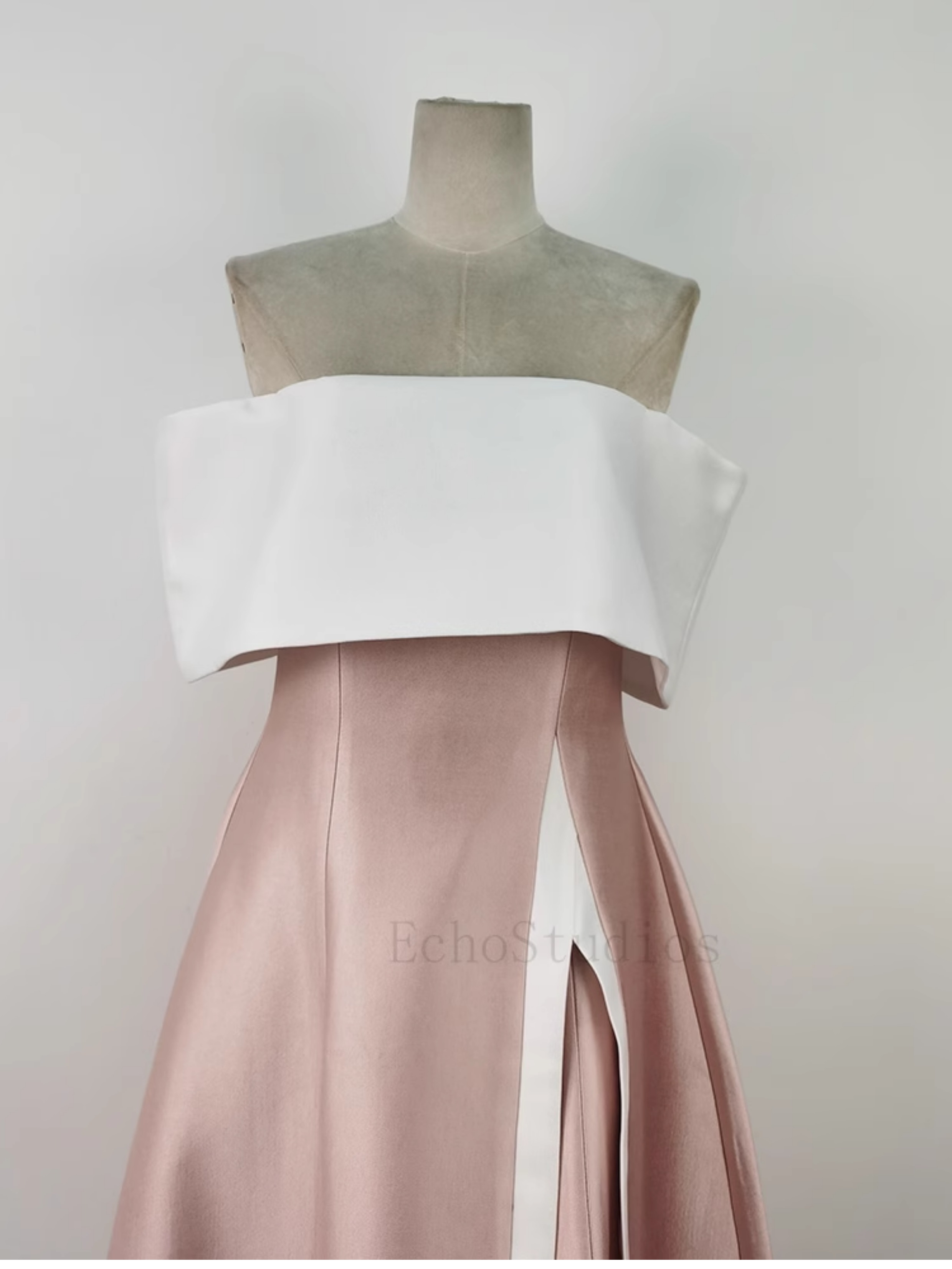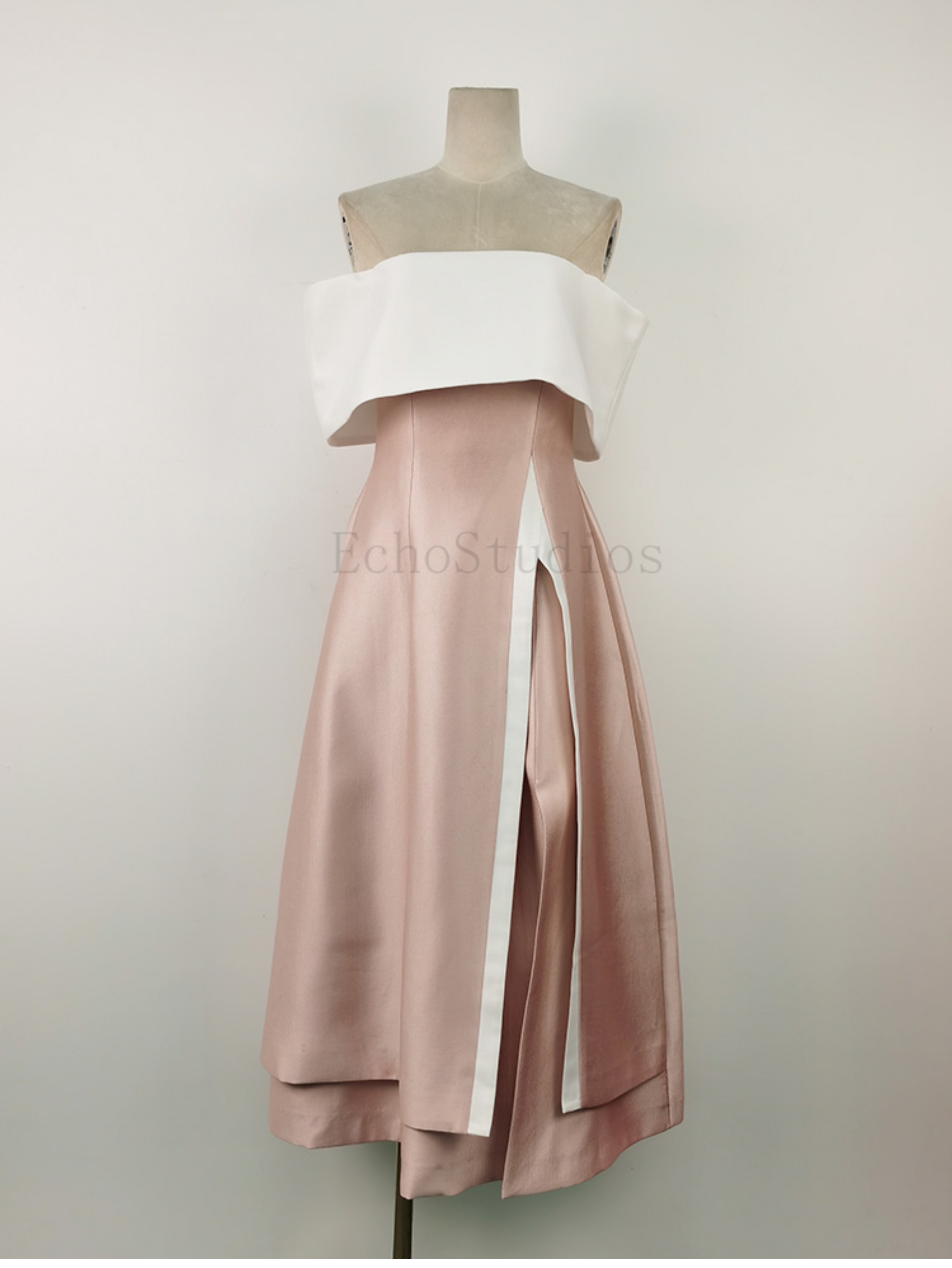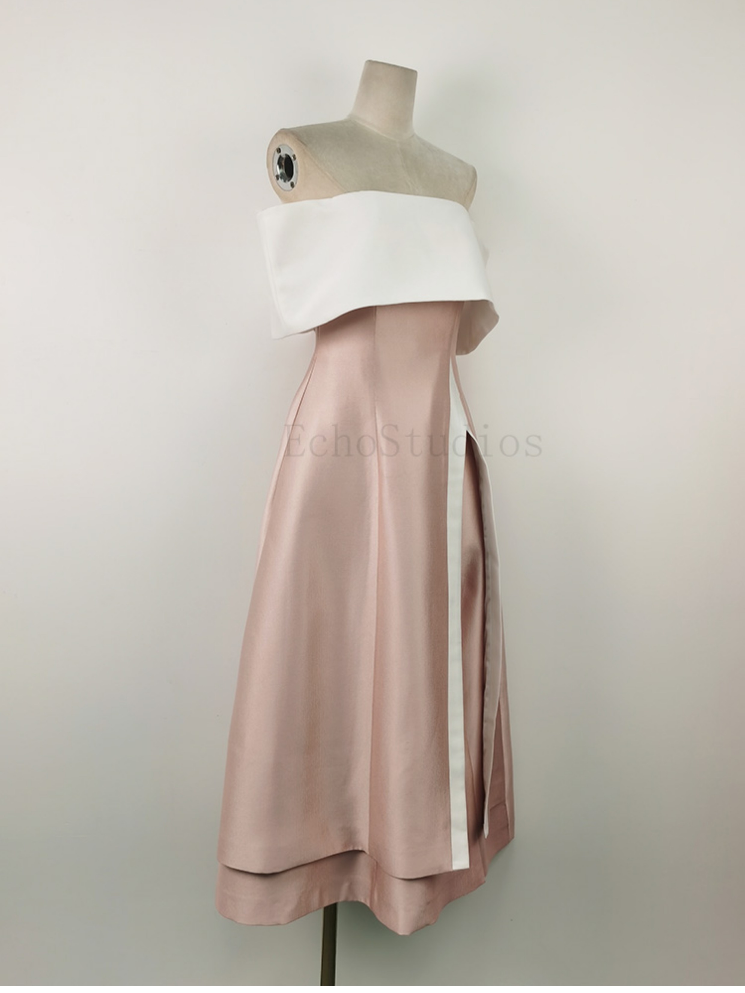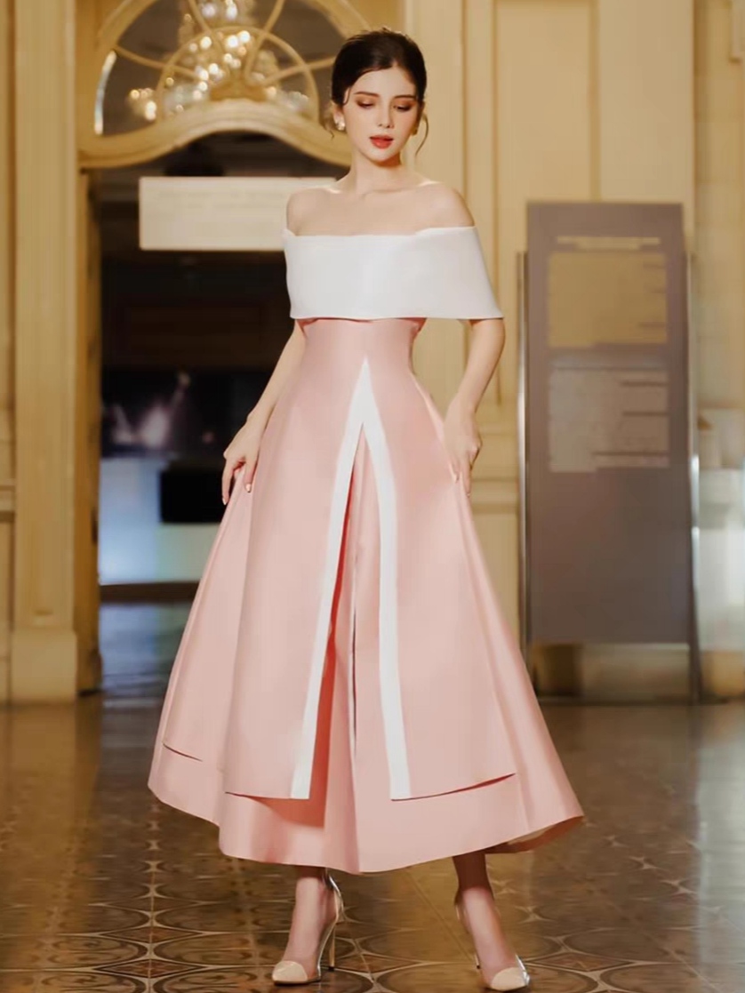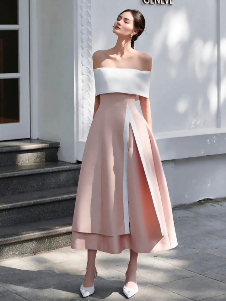产品名称 | Product name: 越南设计师小众粉白色撞色开叉不规则小礼服大摆一字肩优雅连衣裙