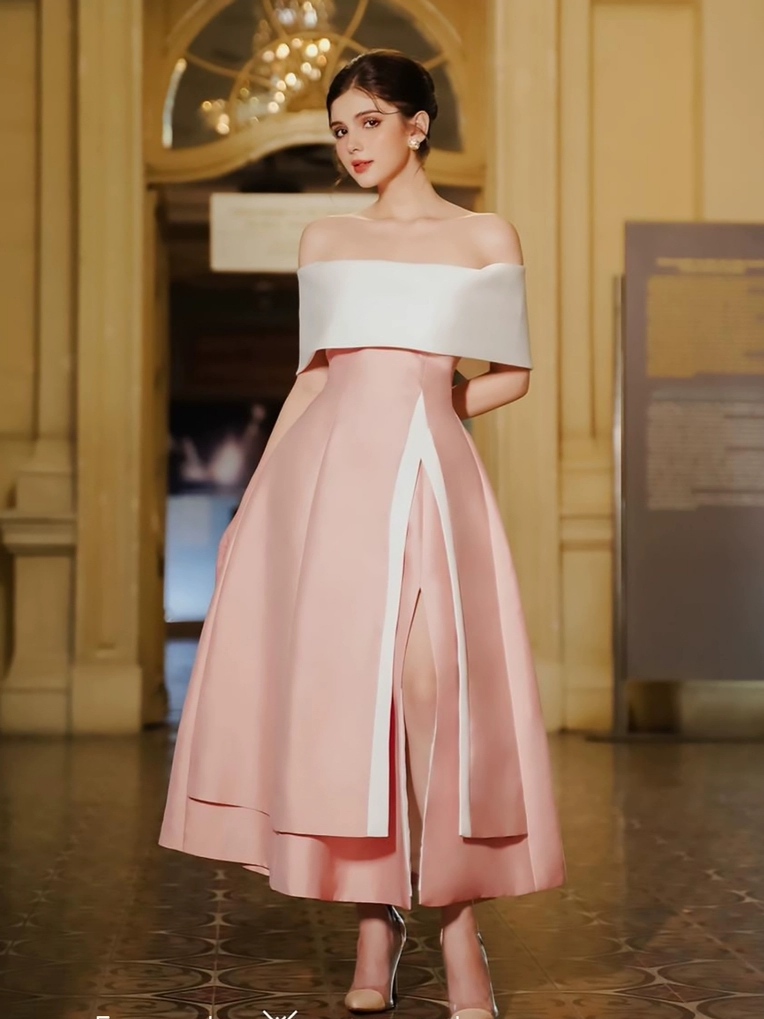 越南设计师小众粉白色撞色开叉不规则小礼服大摆一字肩优雅连衣裙