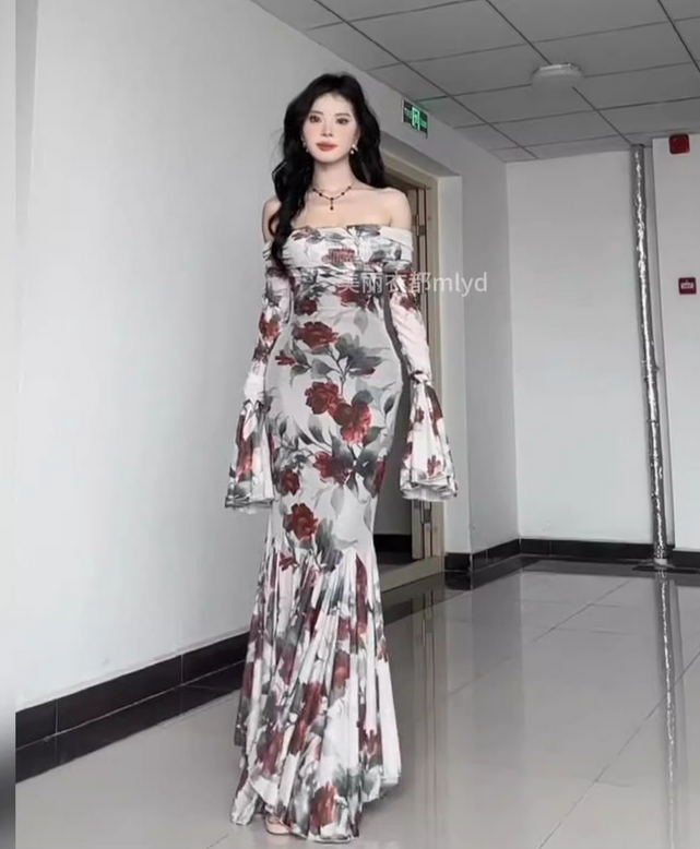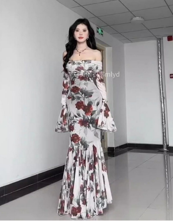 产品名称 | Product name: 大码法式复古玫瑰印花一字肩连衣裙气质修身鱼尾长裙女