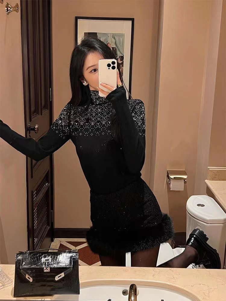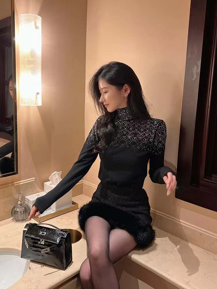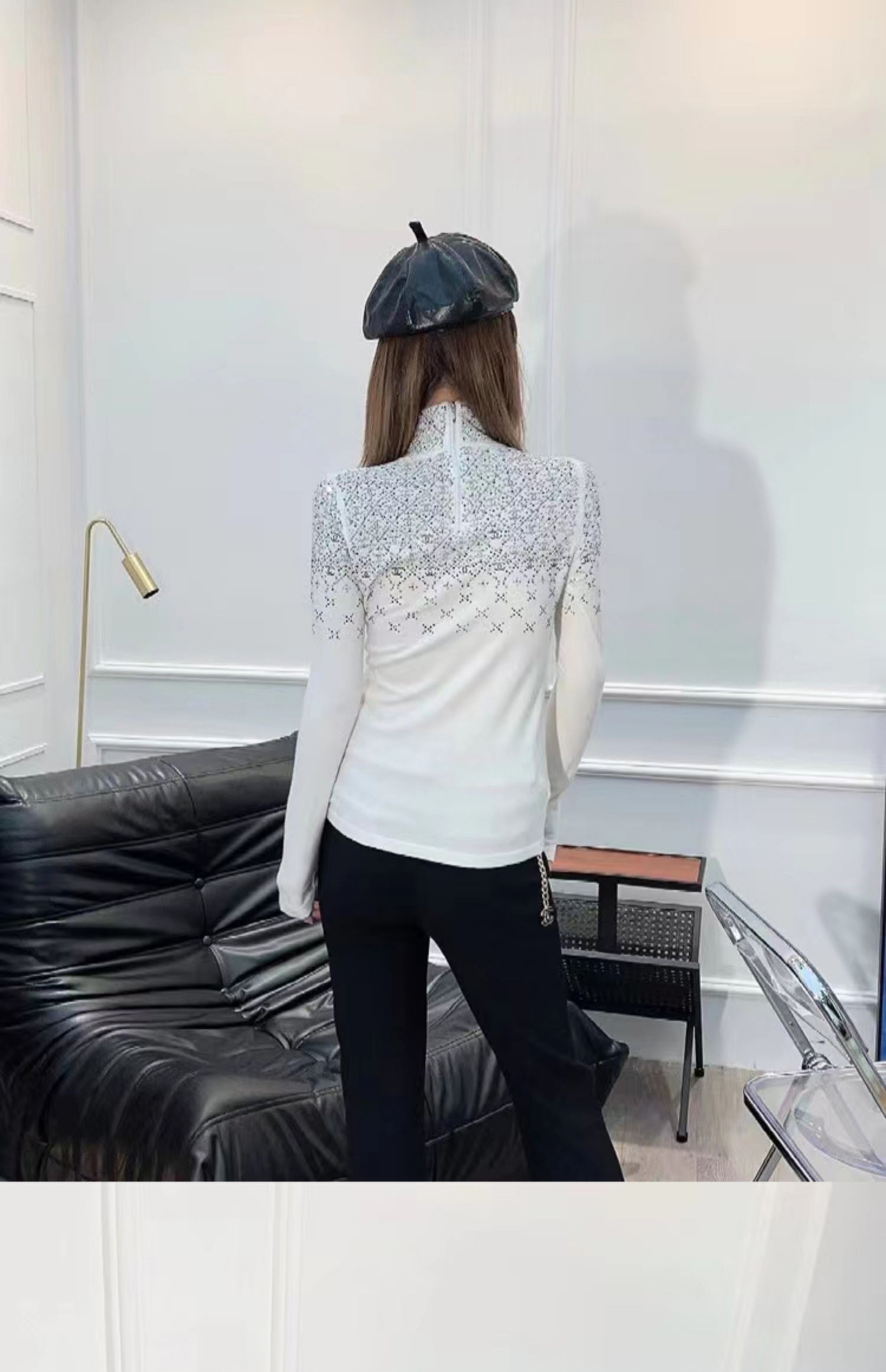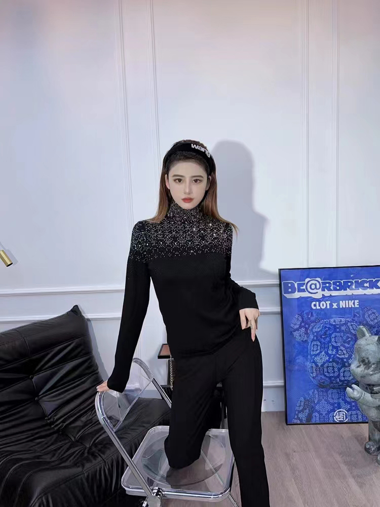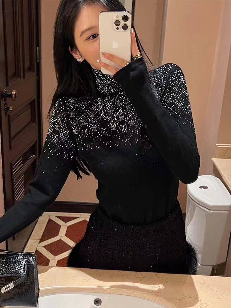 产品名称 | Product name: 秋冬新款时尚高领重工烫钻图案针织打底衫修身套头上衣女