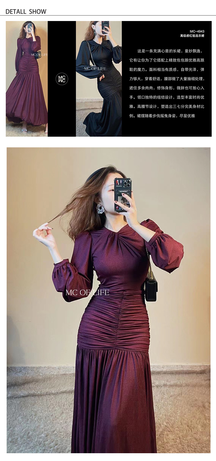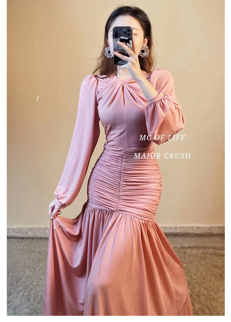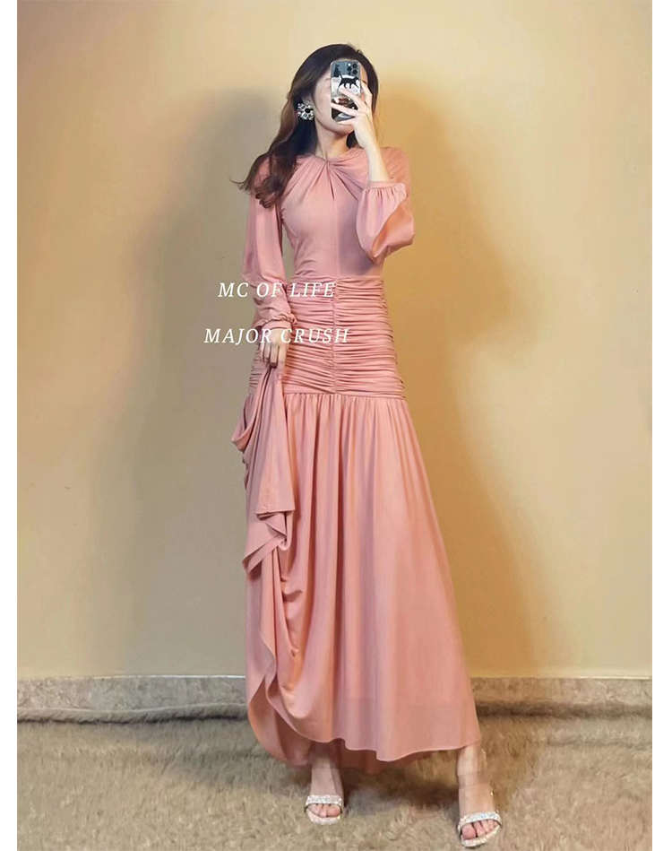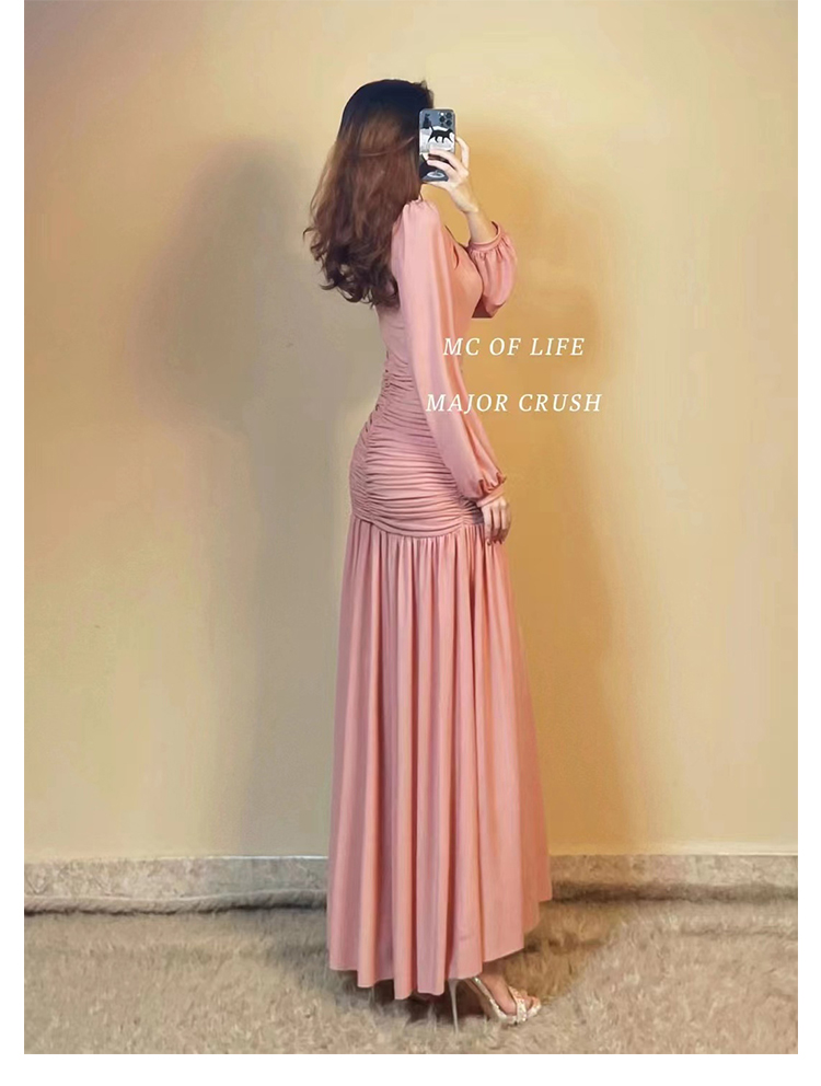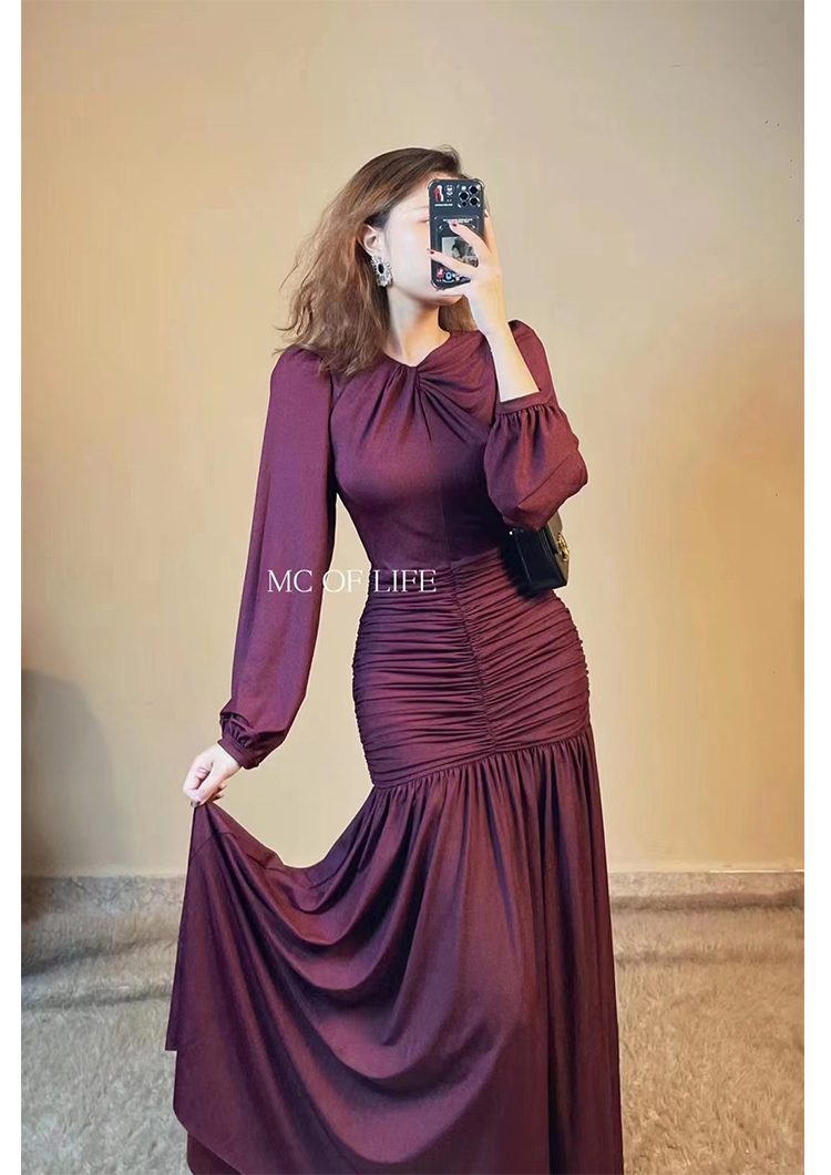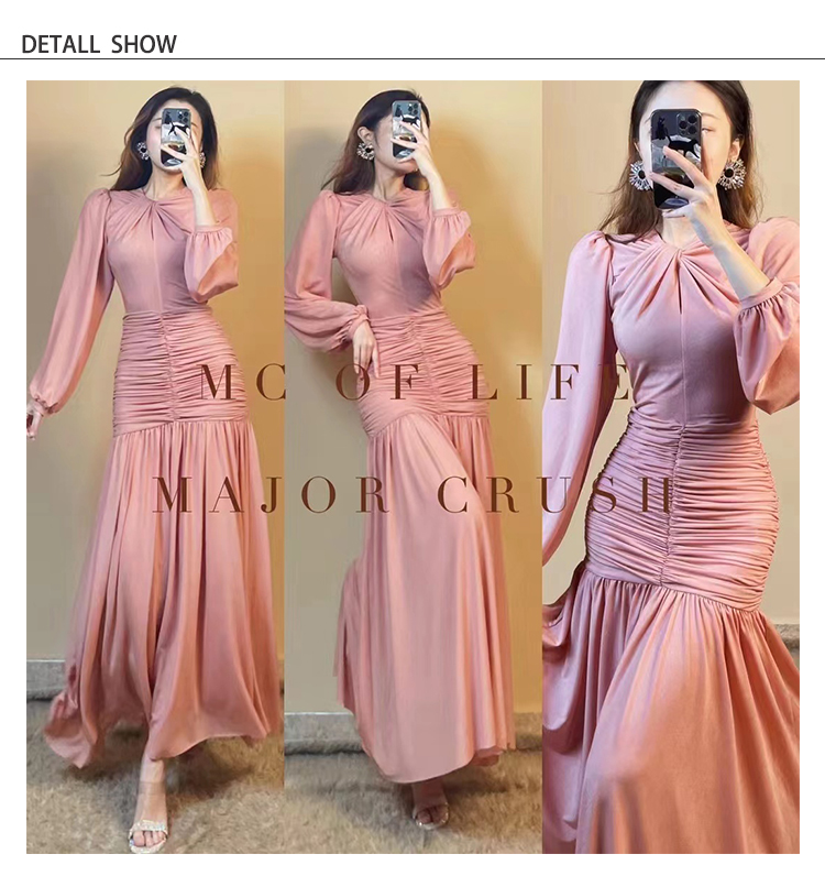 产品名称 | Product name: 重磅新品高端轻奢灯笼袖腰部层层褶皱连衣裙秋冬大摆裙宴会生日裙