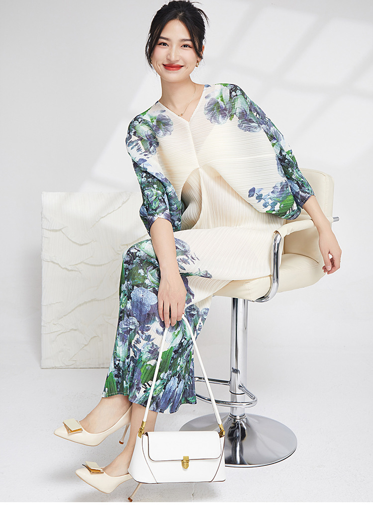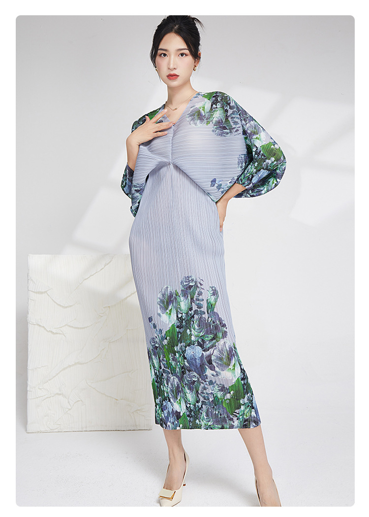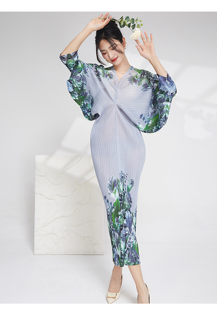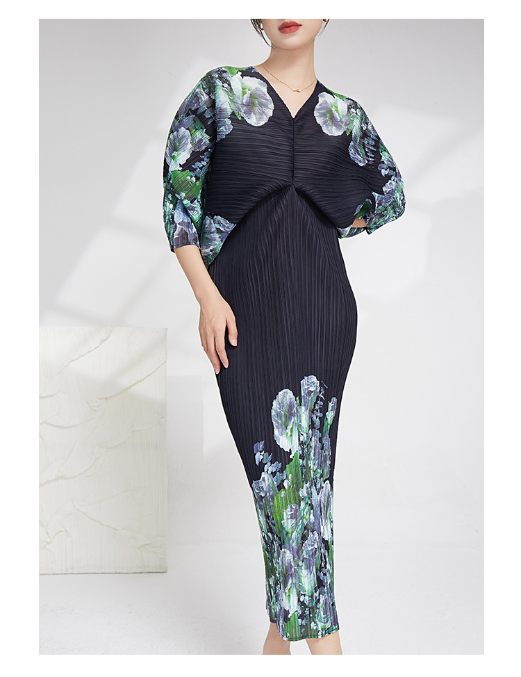 产品名称 | Product name: 三宅褶皱大码连衣裙女宽松遮肉显瘦印花减龄蝙蝠袖长款直筒裙洋