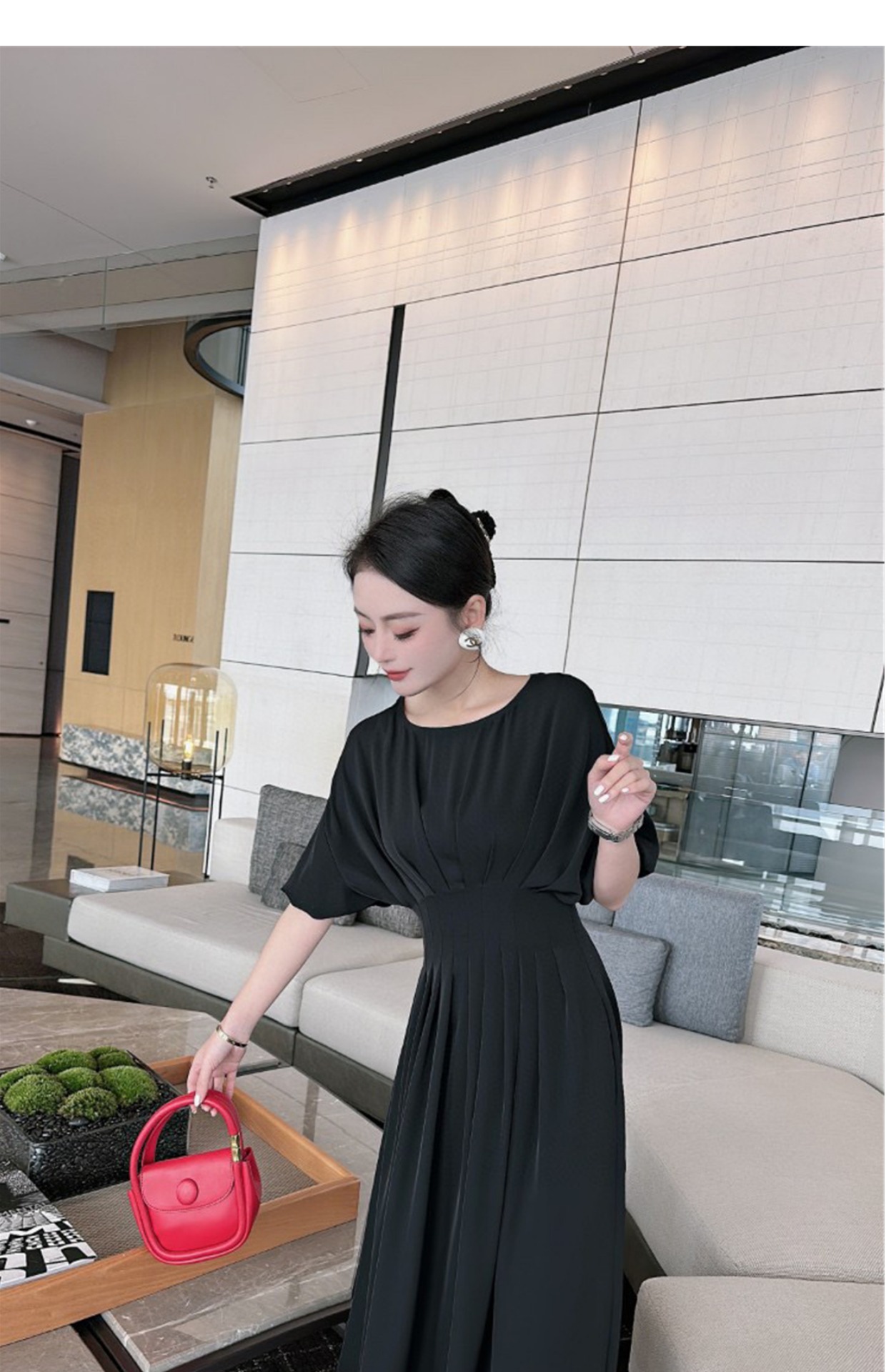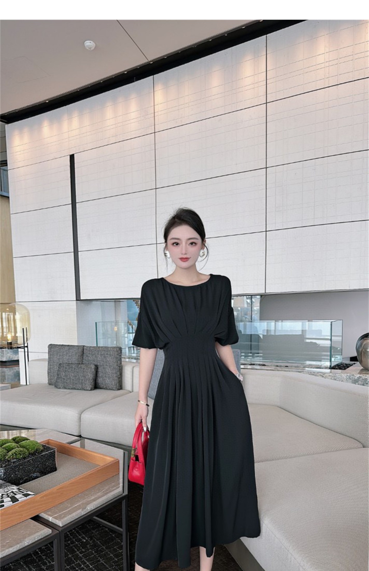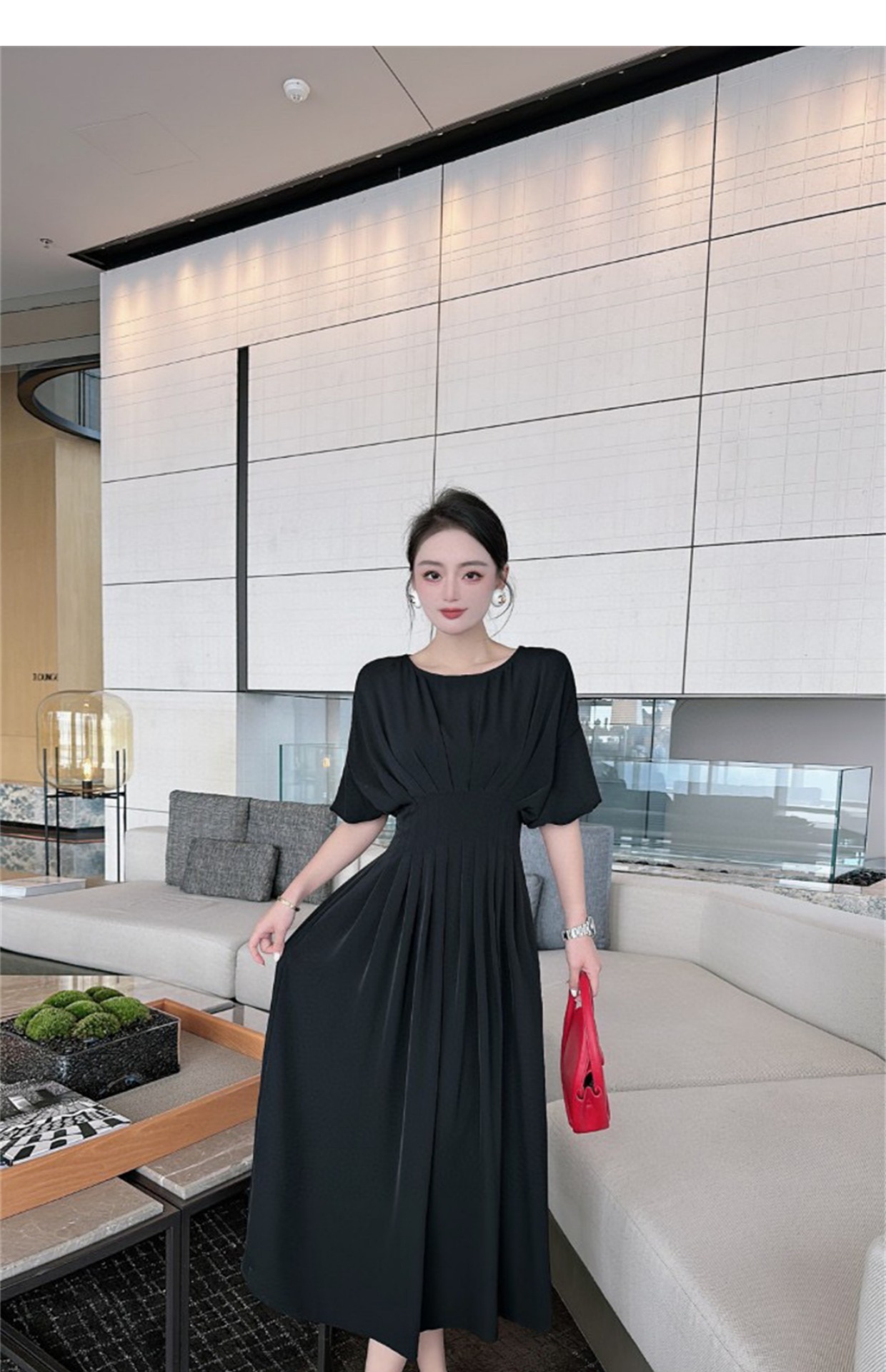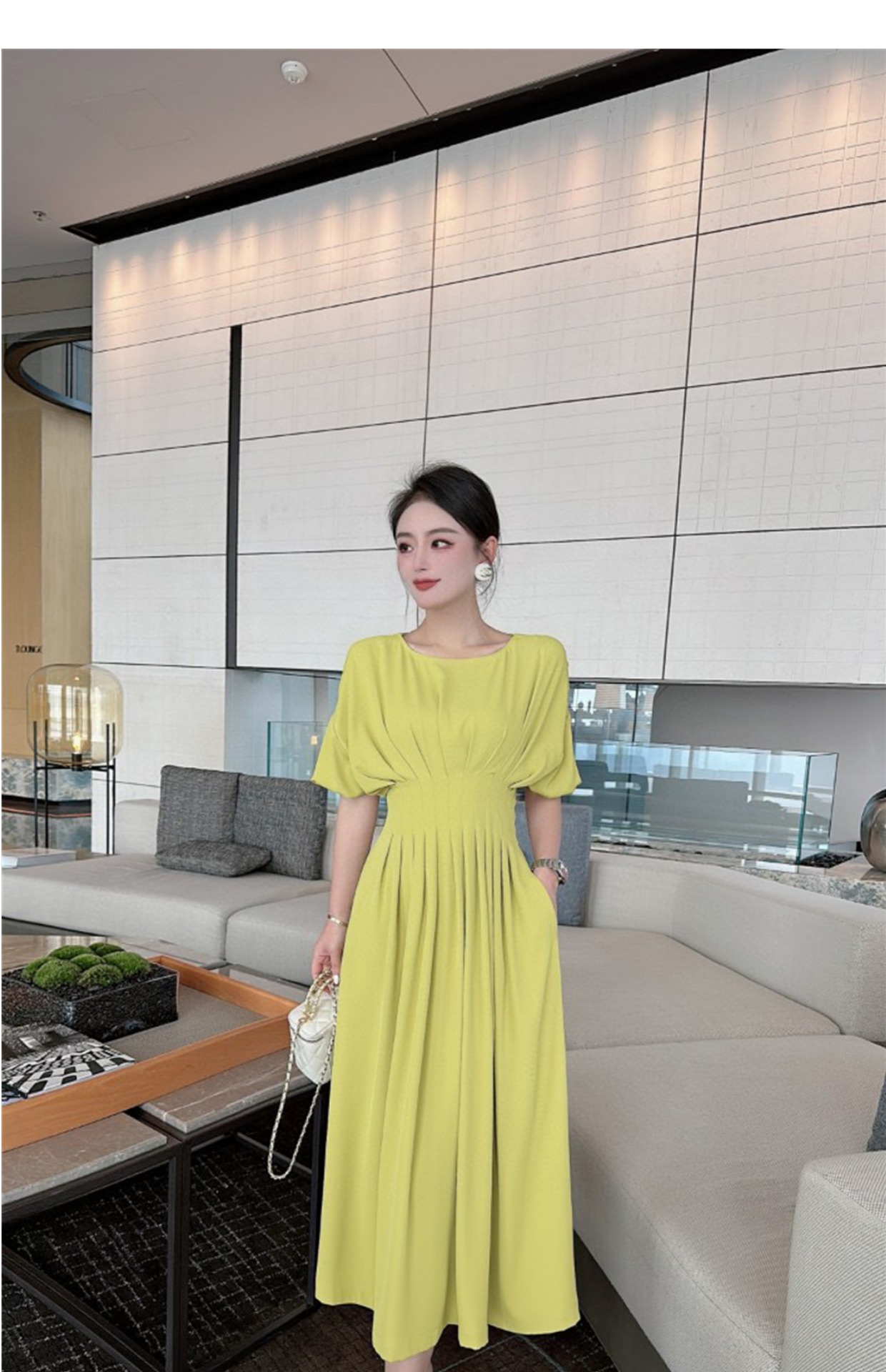 产品名称 | Product name: 神范气质蝙蝠袖收腰褶皱大摆裙设计感慵懒风高腰连衣裙女