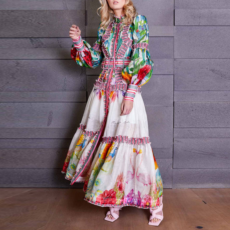 澳洲设计师品牌灯笼袖印花荷叶边单排扣大摆度假甜美优雅连衣裙女